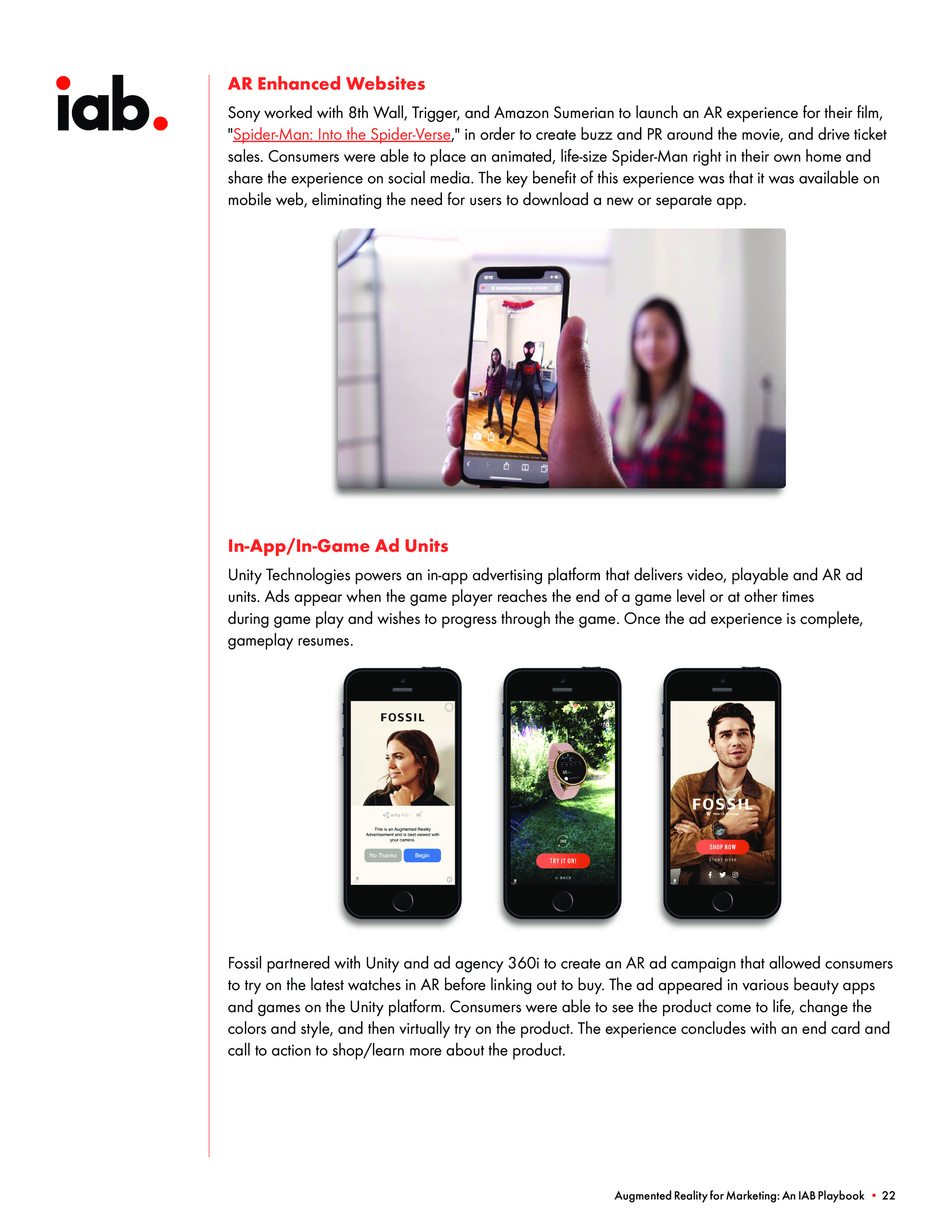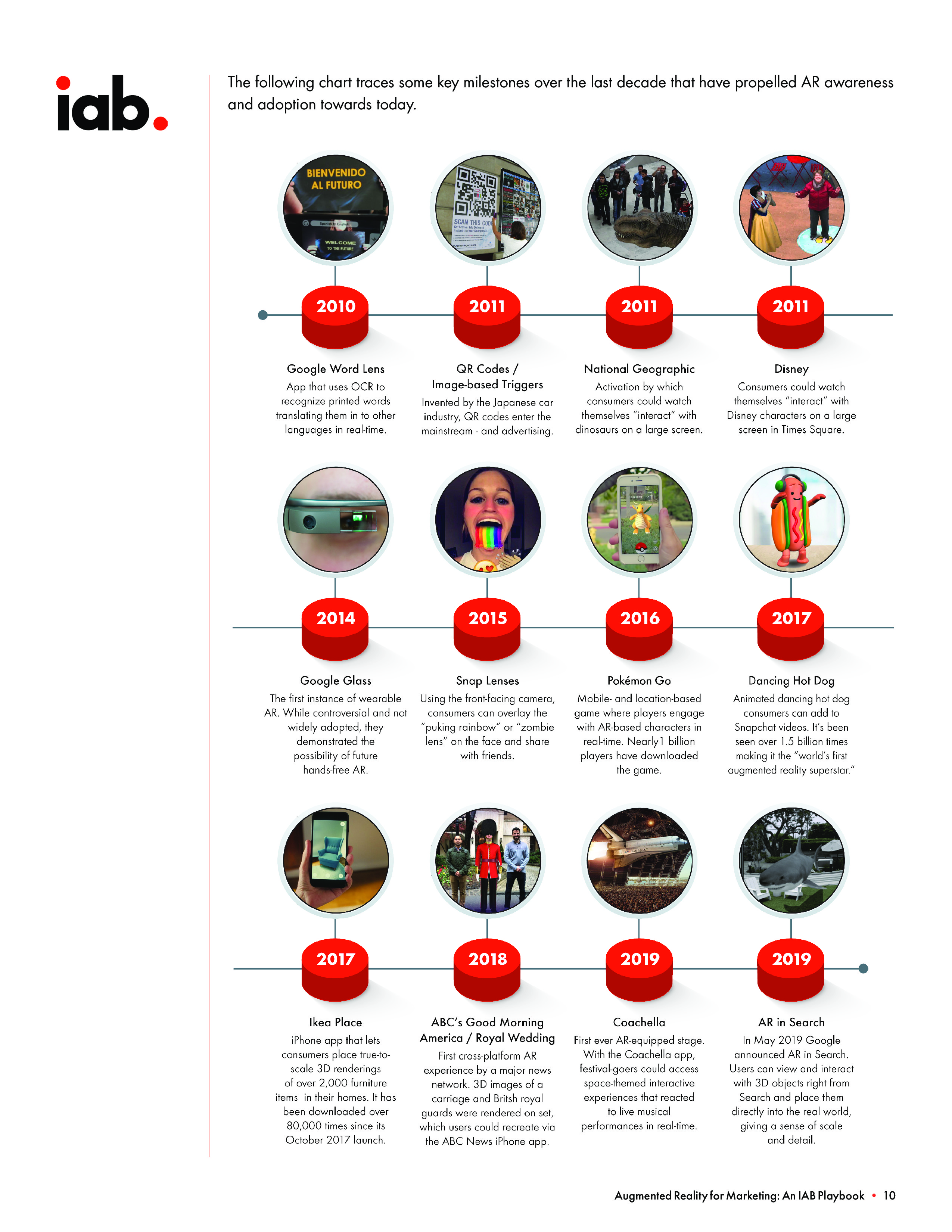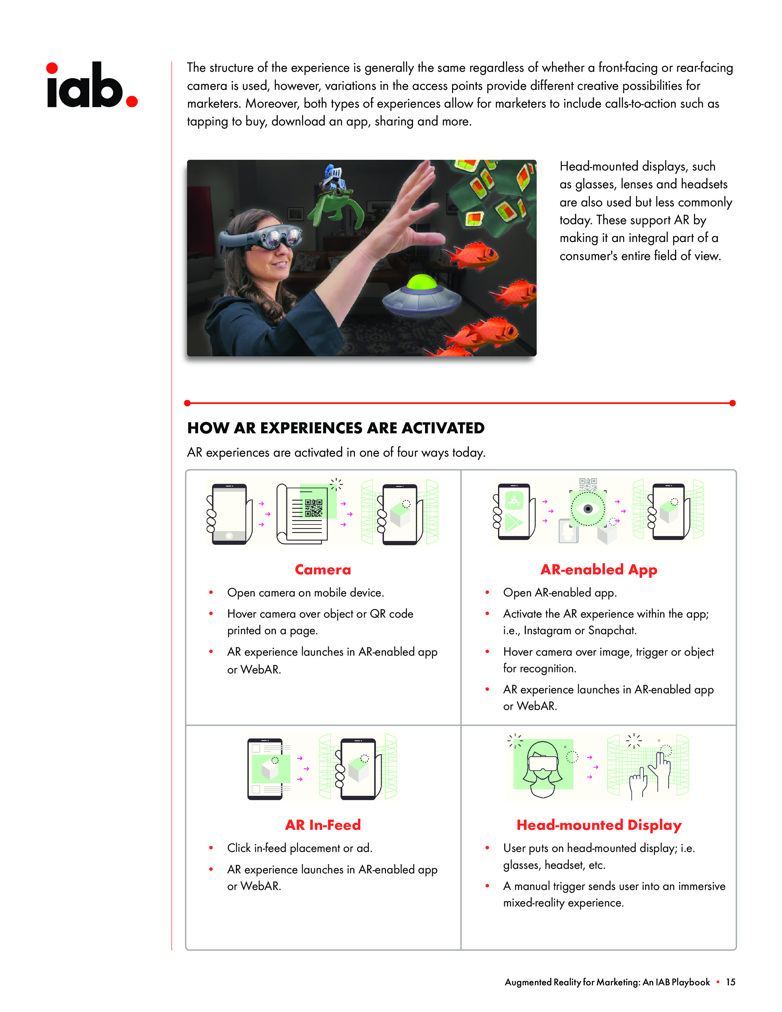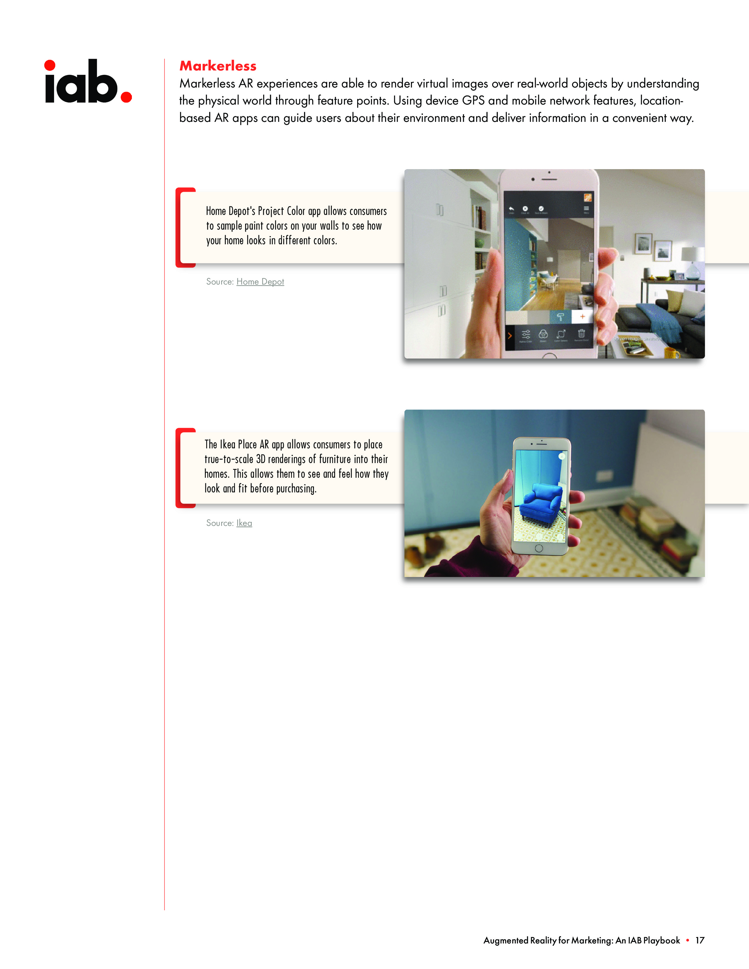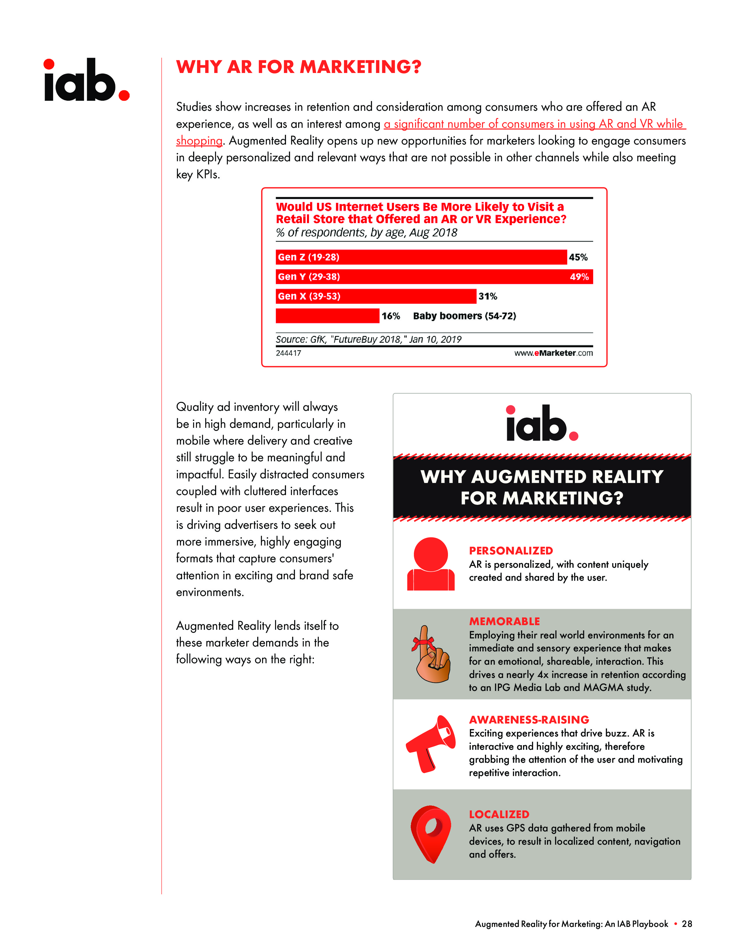 IAB发布了新报告“增强现实在营销中的应用”。增强现实(AR)在消费者中越来越受欢迎,营销人员可以将其作为展现创意的渠道。该技术在各种营销渠道中得到广泛应用,人们只需要带摄像头和应用程序的移动设备就可以体验。