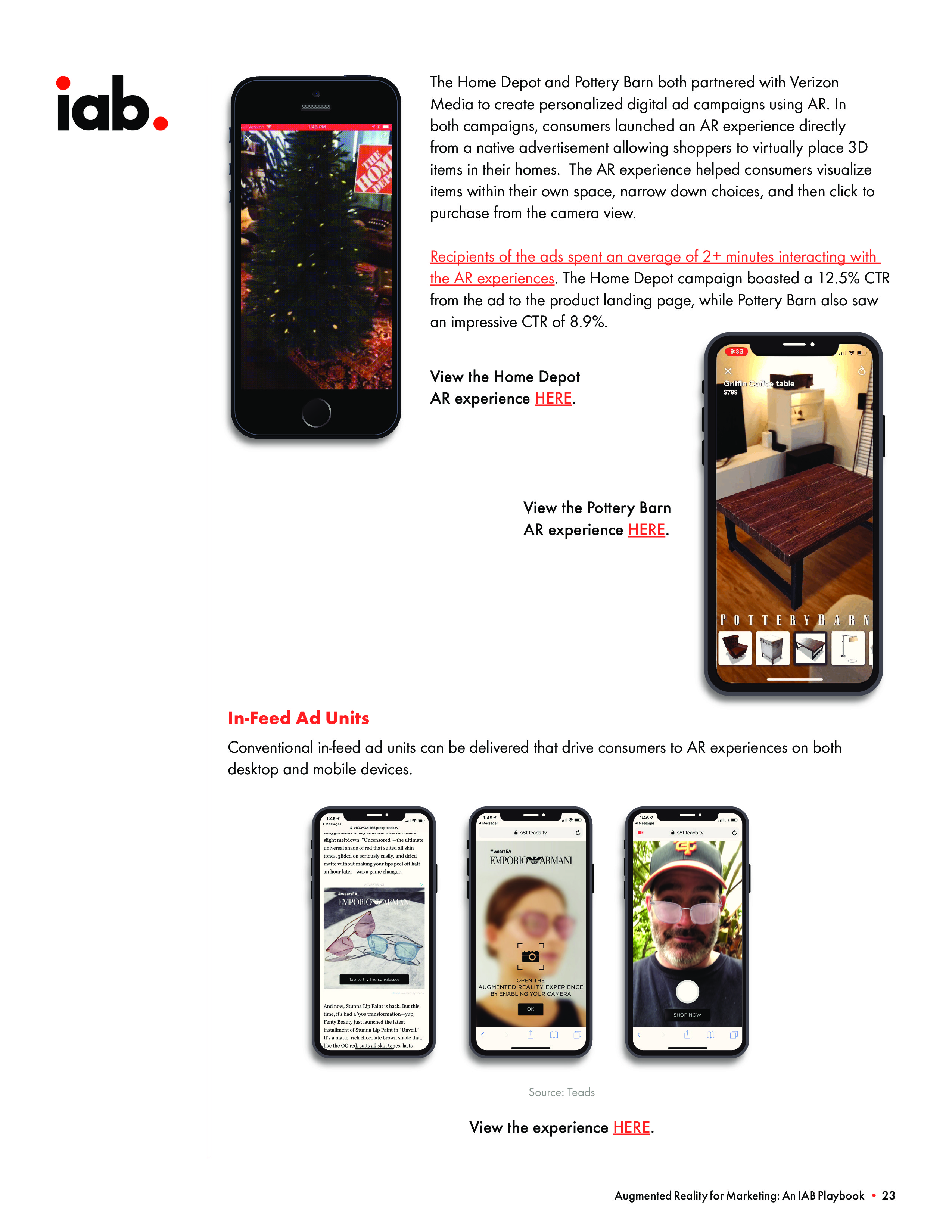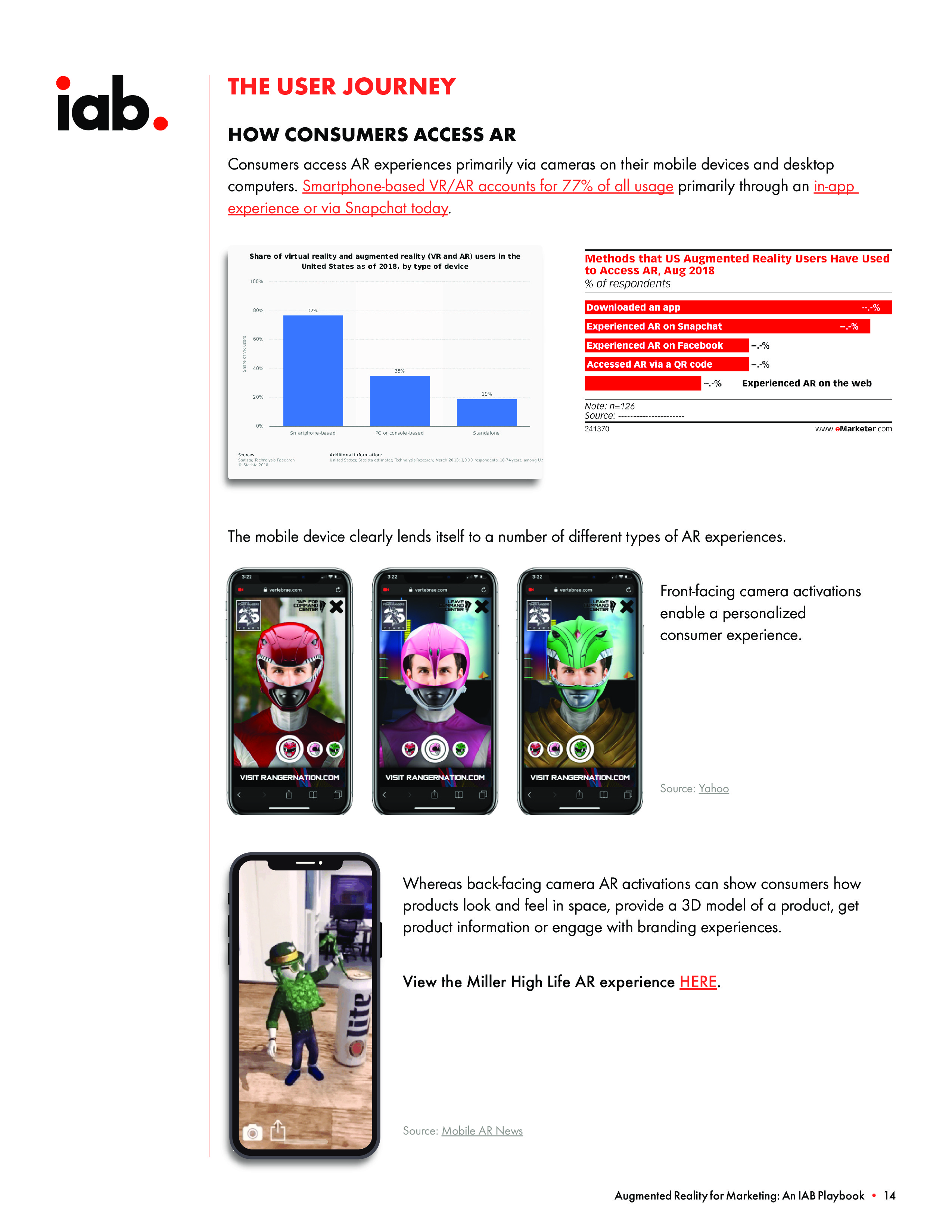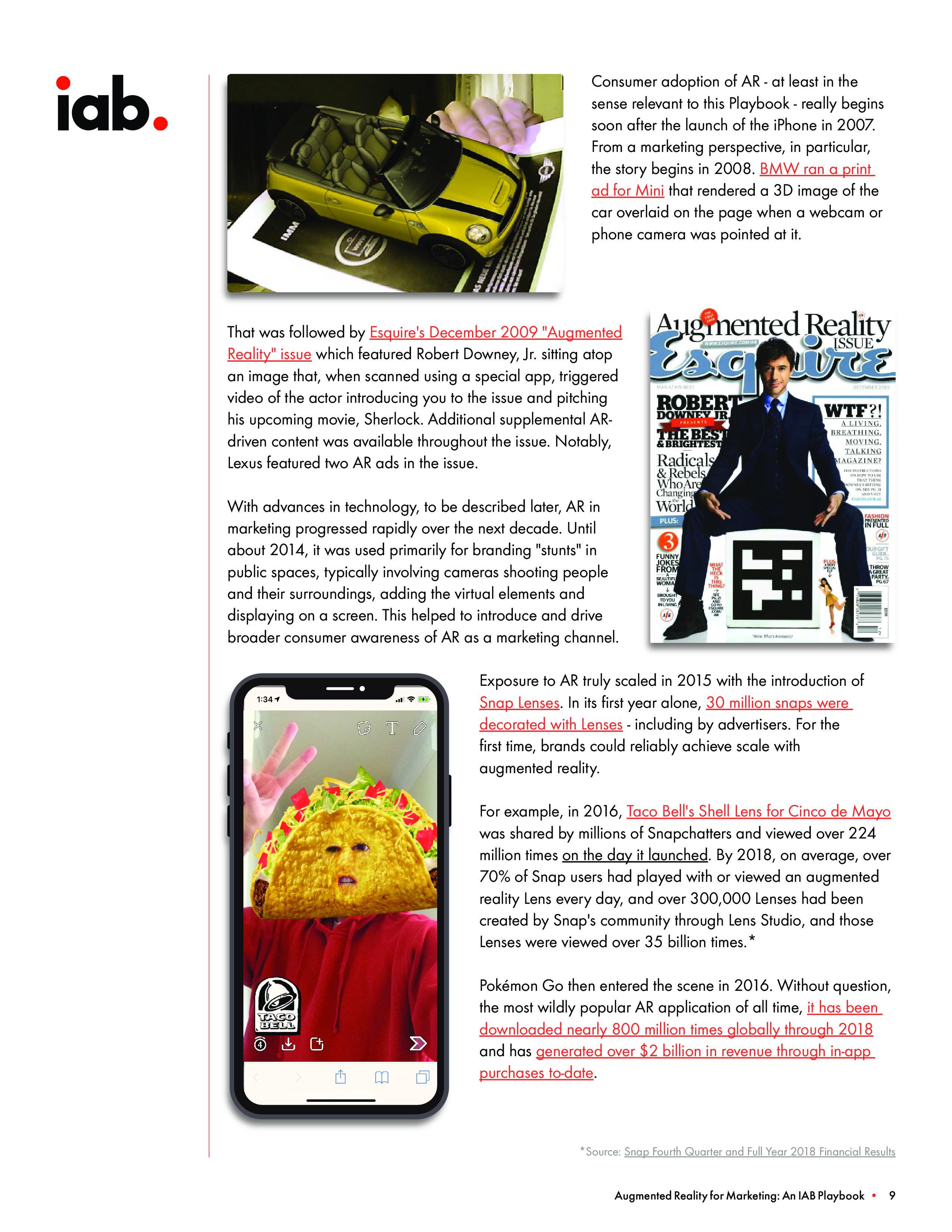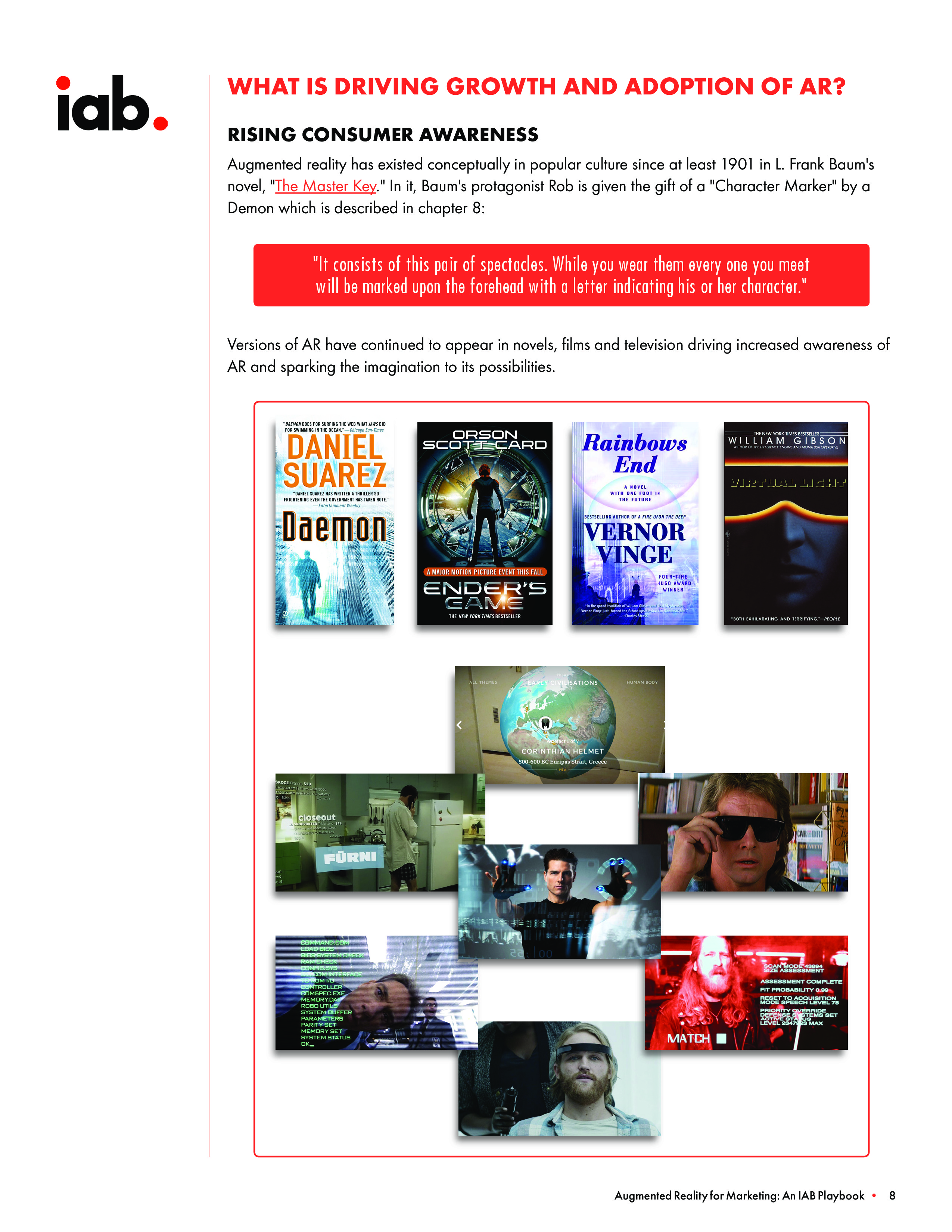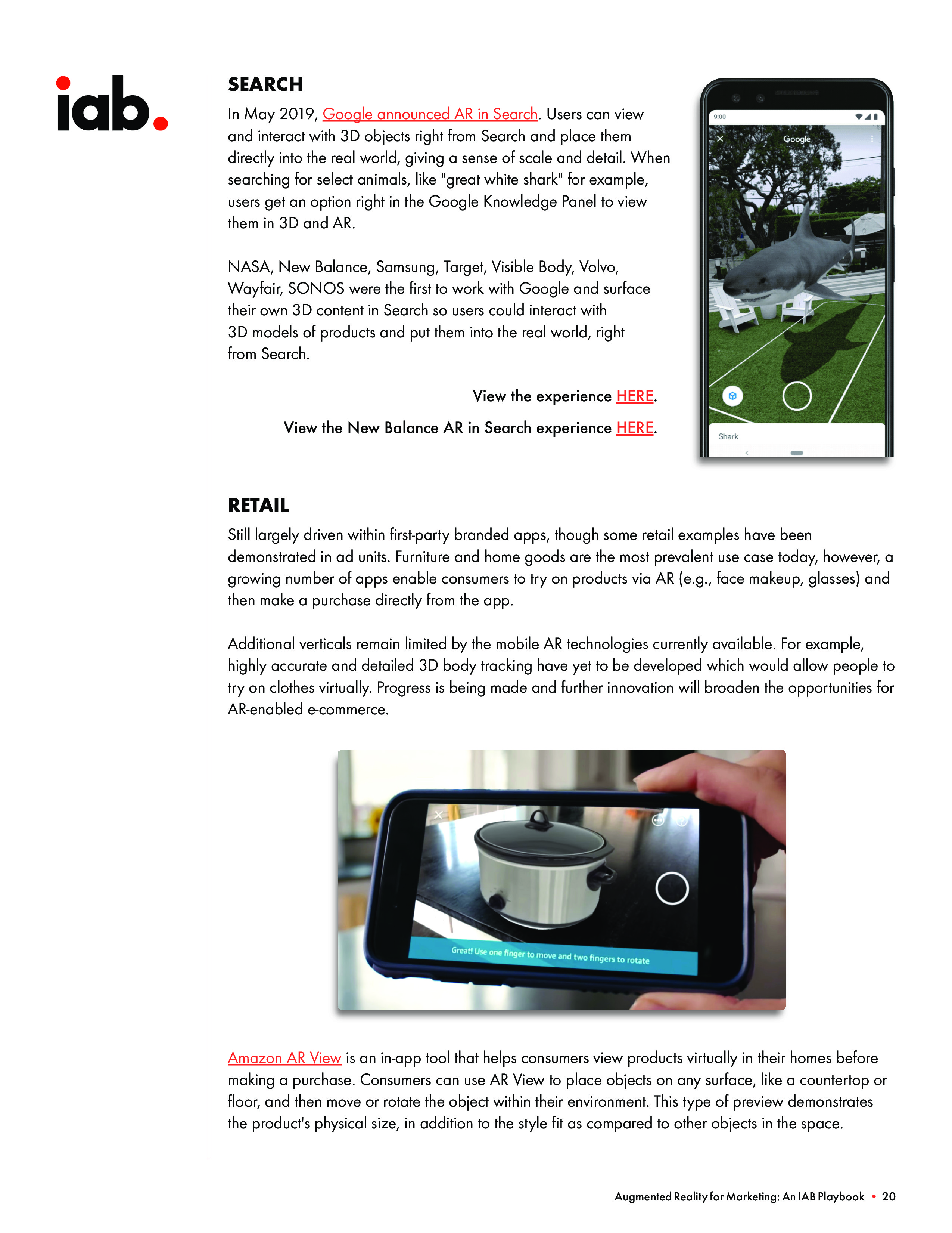 IAB发布了新报告“增强现实在营销中的应用”。增强现实(AR)在消费者中越来越受欢迎,营销人员可以将其作为展现创意的渠道。该技术在各种营销渠道中得到广泛应用,人们只需要带摄像头和应用程序的移动设备就可以体验。