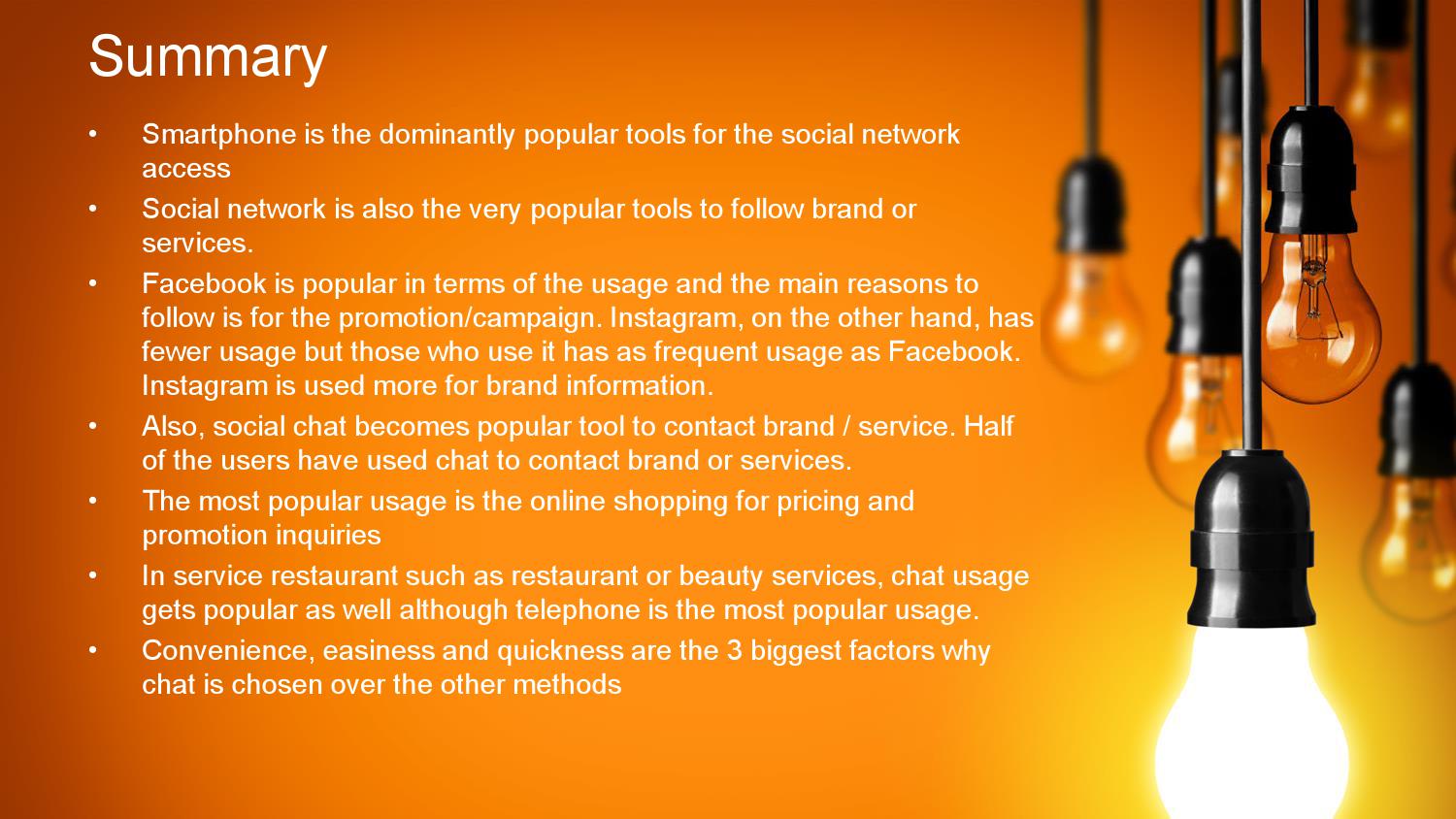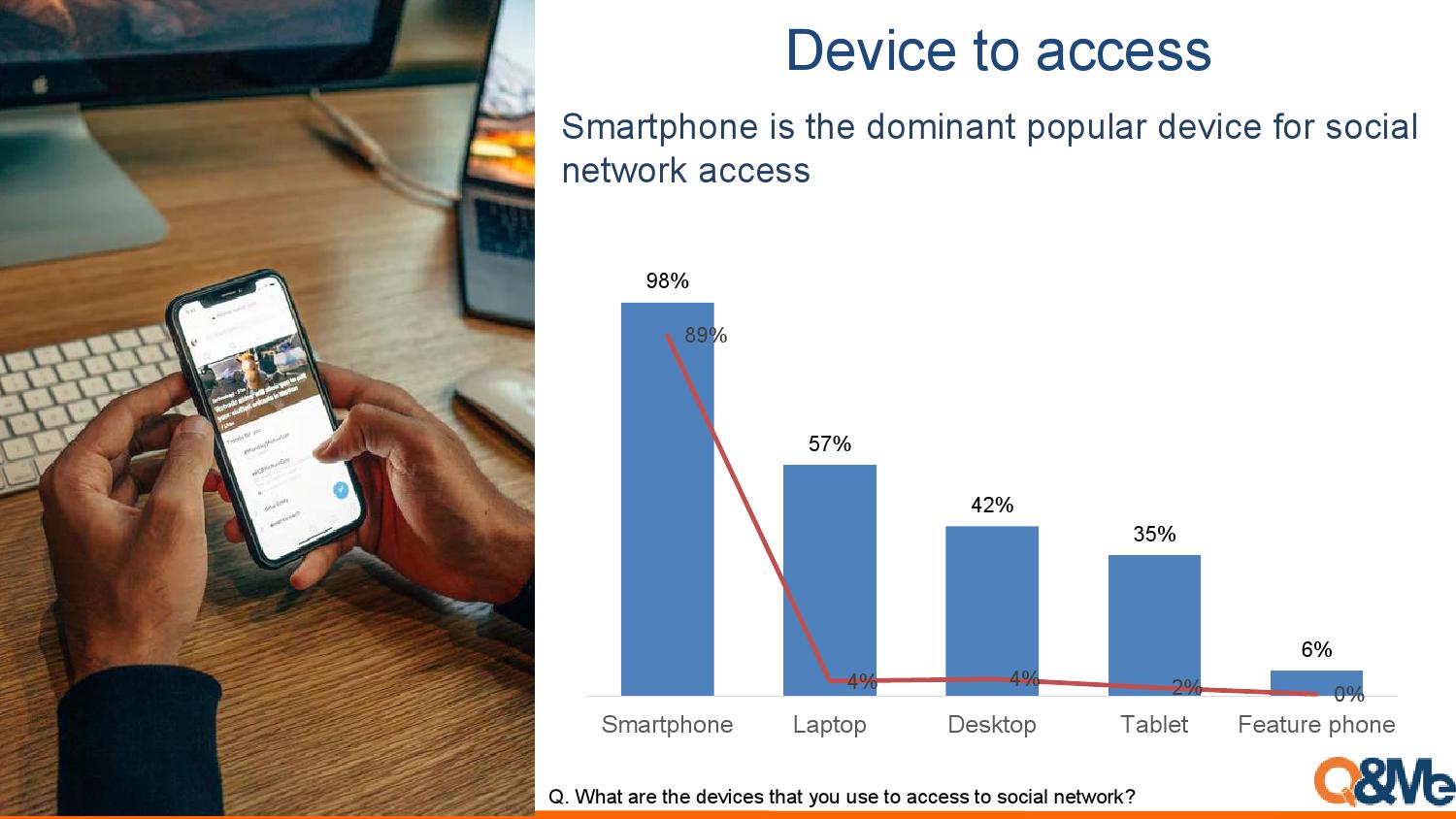 智能手机是访问社交网络的主要设备,占了98%的比例,使用平板电脑访问社交网络的占57%,使用台式电脑访问社交网络的占42%。