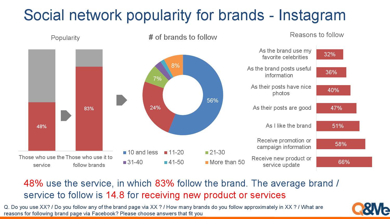 其中48%的人使用Instagram,83%的人关注Instagram的新动态。66%的用户使用Instagram的原因是为了接收新产品或服务的更新;58%的用户是为了接收促销或活动信息,51%的用户因为就是喜欢这个Instagram这个平台,还有一部分用户是因为喜欢Instagram的帖子,或者是因为自己喜欢的名人明星也使用Instagram。
