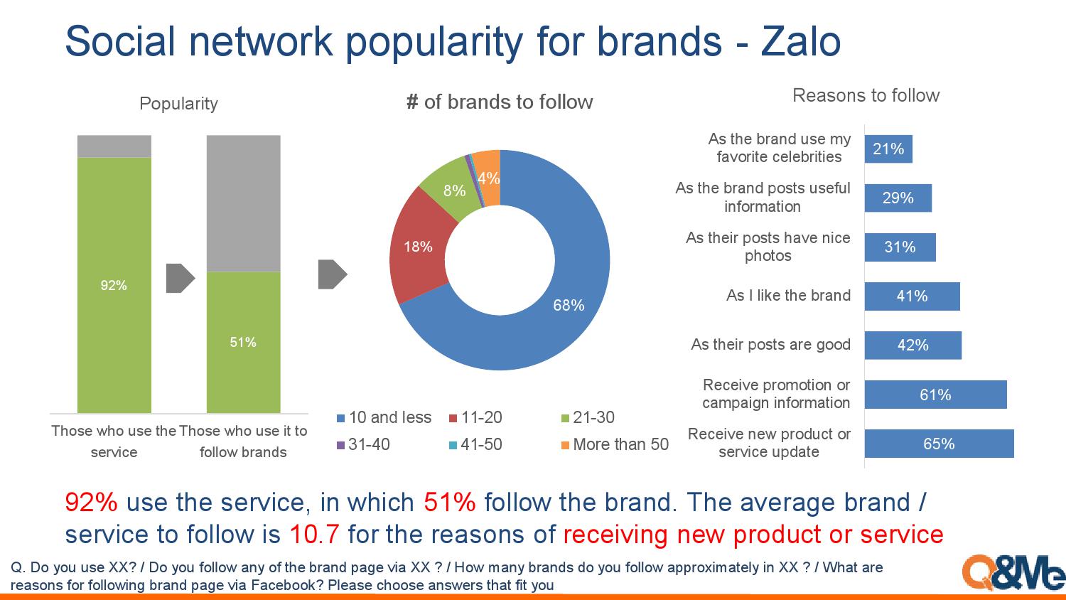 65%的用户使用Zalo的原因是为了接收新产品或服务的更新;61%的用户是为了接收促销或活动信息;42%的用户觉得Zalo的帖子很好。