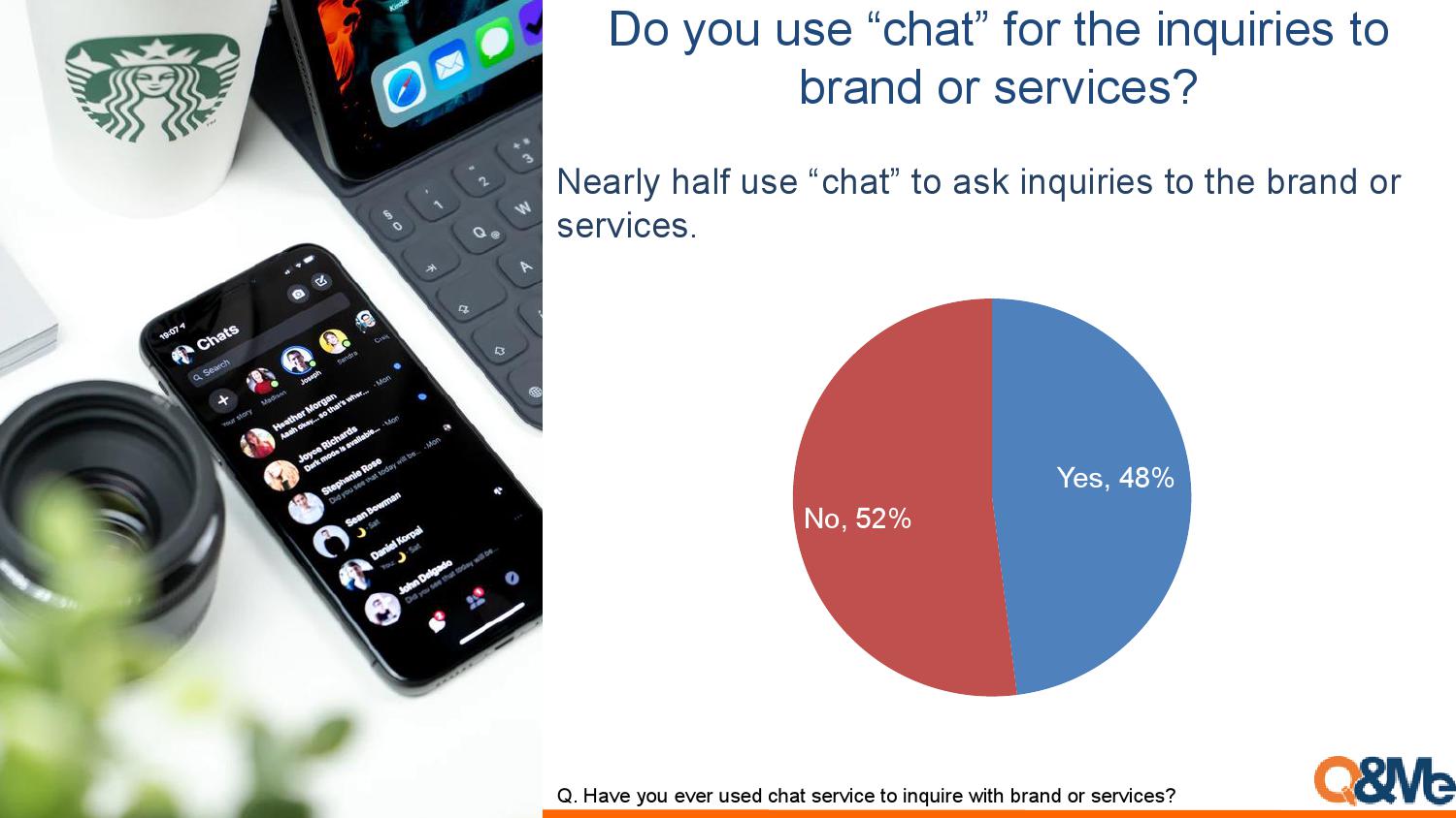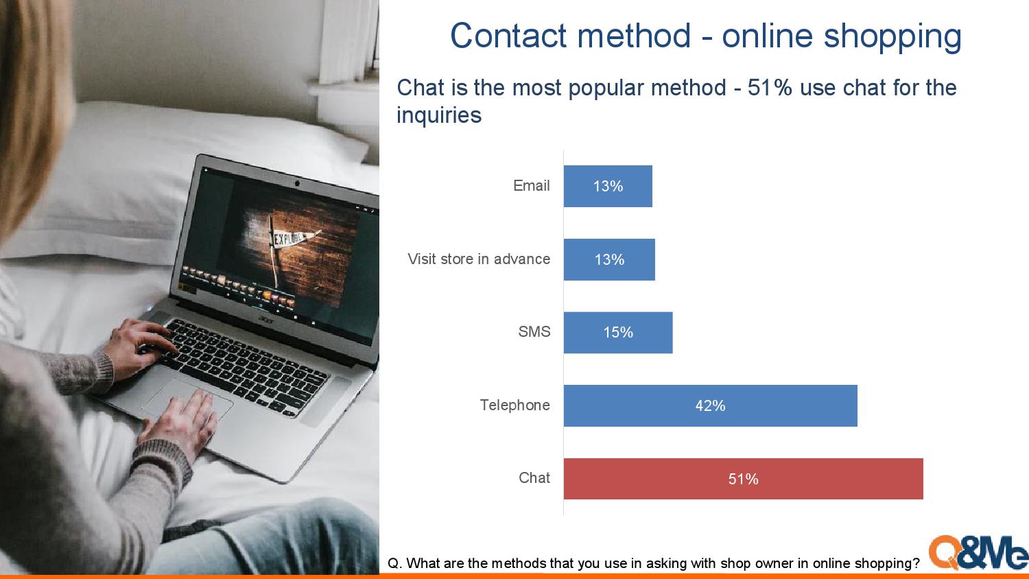 51%的用户网上购物都喜欢直接用聊天的方式咨询,42%的用户使用手机进行沟通,还有15%是通过SMS咨询。