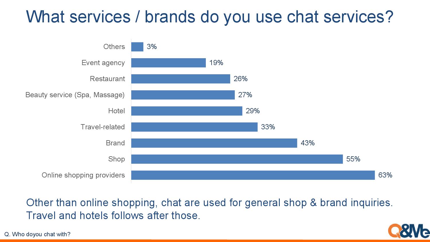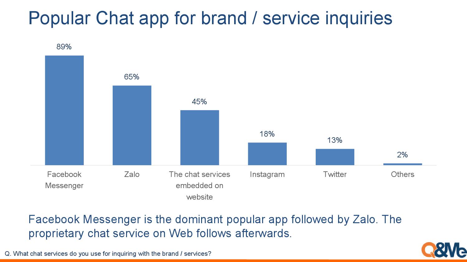 89%的用户使用Facebook聊天,其次是Zalo,45%是网站上嵌入的聊天服务。