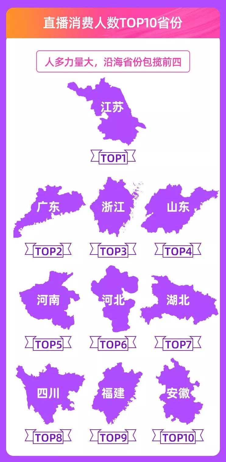 从不同年龄段最爱在直播间购买的商品类型来看,90后、00后最爱买的前三名分别是美容护肤、女装和彩妆香水。而60后、70后则更喜爱在直播间剁手珠宝翡翠等。从地域来看,江苏、广东、浙江等沿海省份是直播消费人数的前三大省。河南、湖北、四川、安徽等内陆地区同样也热衷在直播间剁手。而不同地方消费者在直播间里最爱购买的商品出奇一致,美容护肤、女装、洗护、彩妆等最为畅销。