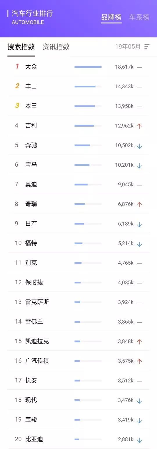 在5月的榜单中,大众位列第1名,丰田、本田、吉利和奔驰位列第2-第5名,第6-10名分别为宝马、奥迪、奇瑞、日产和福特。