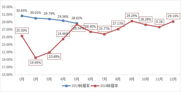 1-5月份二手车转籍总量为166.71万辆,转籍比例为29.68%,与去年同期相比增长了5.69个百分点。