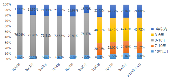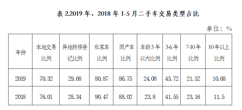 可以看到车龄在6年以内的车型占了总交易量的69.15%。另外,车龄在10年以上的车型比例与去年同期相比有小幅度增长,2019年5月共实现交易12.44万辆。