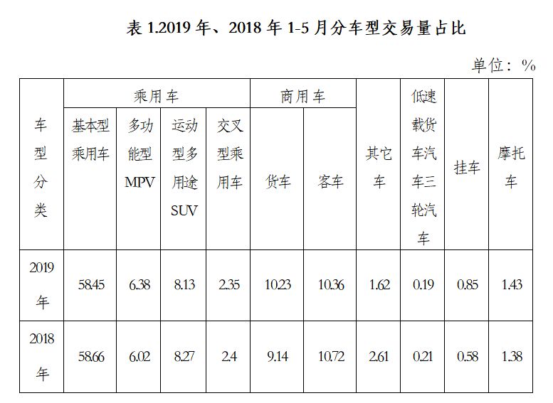 从细分市场的交易情况来看,2019年1-5月基本型乘用车共交易328.34万辆,同比增长0.92%;客车58.22万辆,同比下降2.04%;载货车57.45万辆,同比增长13.3%;SUV45.65万辆,同比下降0.51%;MPV 35.85万辆,同比上升7.38%;交叉型乘用车13.22万辆,同比下降0.61%。2019年开年作为生产资料的载货车市场表现优秀,同比正增长超过10%。