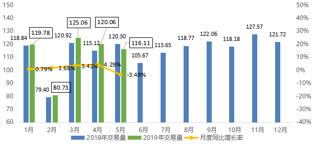从2019年各月度交易走势来看,前4个月全国二手车交易量月度同比小幅回升,呈现缓慢持续增长趋势。 5月全国二手车交易量为116.11万辆,同比下降3.49%,交易量同比首次出现负增长。