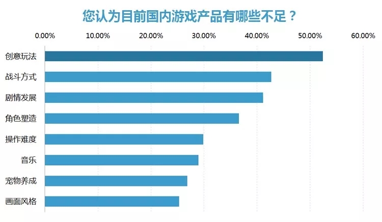 在玩法方面,用户主要诟病游戏玩法缺乏创意。伽马数据调研结果显示,过半用户认为创意玩法是当下游戏最主要的不足,排名在所有九个选项中居首。