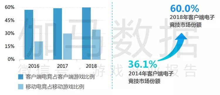 在客户端游戏与移动游戏两大细分市场中,竞技游戏所占份额正随着市场的不断成熟而增长。但从占比看,移动电子竞技游戏占比依然低于客户端游戏市场,这表明移动电子竞技游戏依然具备发展空间。