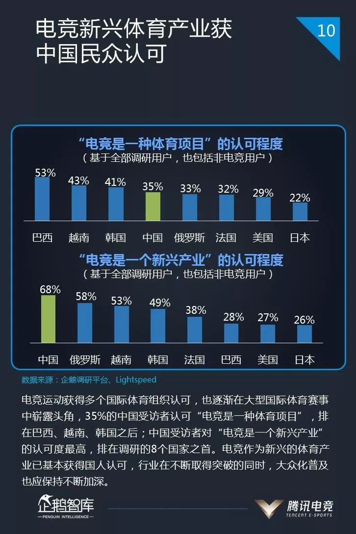 在这一背景下,企鹅智库再次联合腾讯电竞与《电子竞技》杂志,发布这份《世界与中国:2019年全球电竞运动行业发展报告》。今年,除了通过企鹅调研平台,对全国范围内手机网民进行广泛调研之外,我们还首次对海外7个国家,包括美国、日本、韩国、法国、巴西、越南、俄罗斯的用户进行精准调研,以展示不同国家的电竞产业发展情况。
