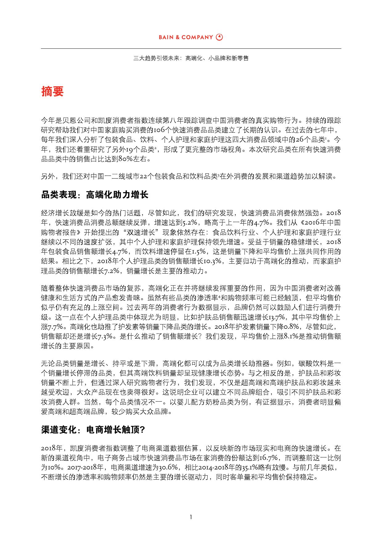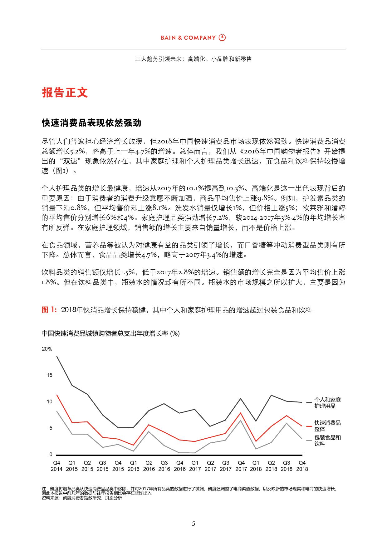 尽管经济增长出现放缓,但中国快速消费品市场增长依然强劲。全球领先的连续性消费者样组研究机构凯度消费者指数与贝恩公司今日发布的2019年中国购物者报告系列一《三大趋势引领未来:高端化、小品牌和新零售》显示,2018年,中国快速消费品消费总额延续了上一年的反弹趋势,增速达5.2%,略高于2017年的4.7%。随着中国消费者消费意愿的不断增强,高端化趋势对行业复苏的贡献突出,平均售价提高了 4.6%。