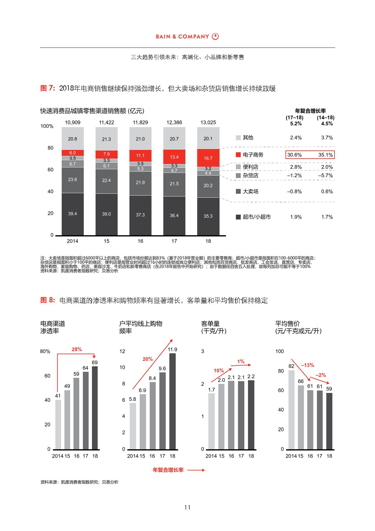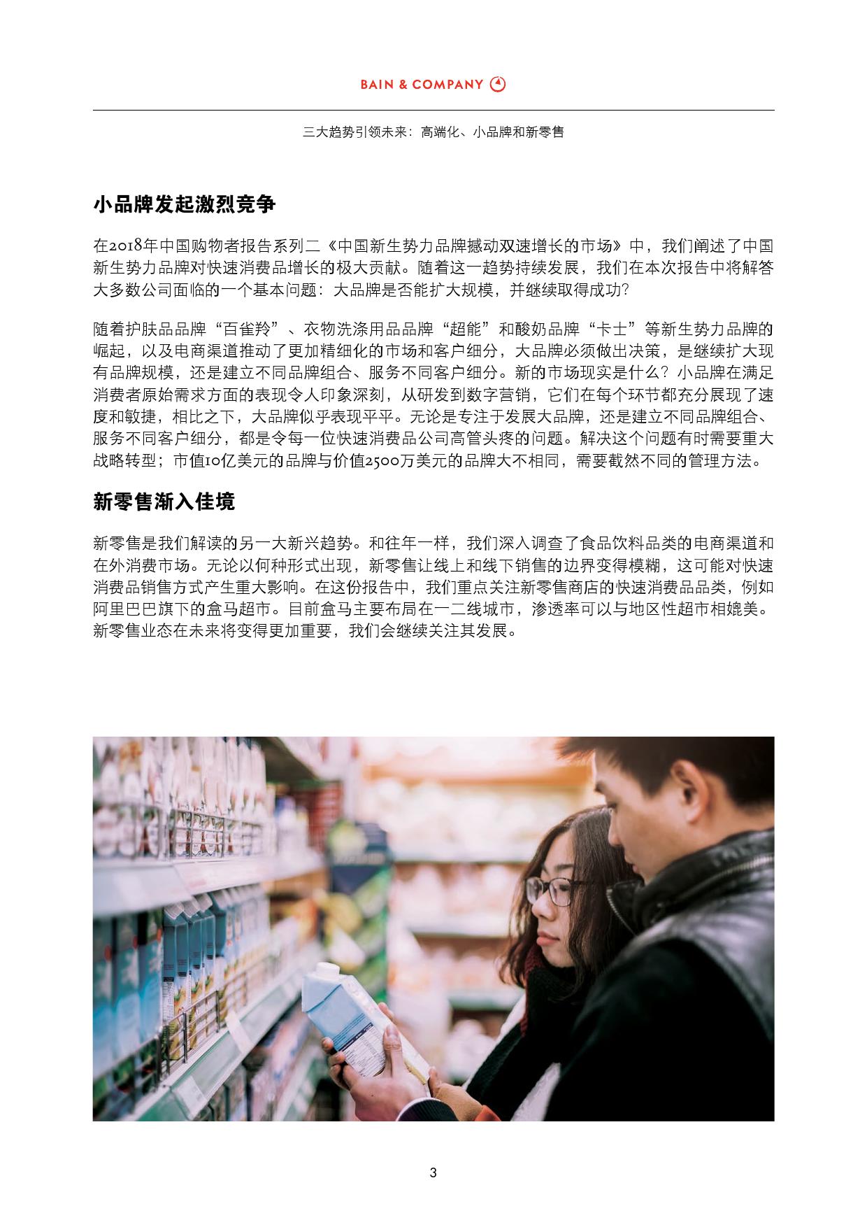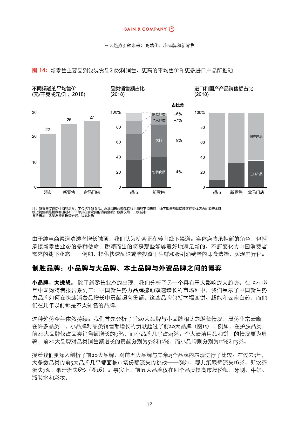 除上述趋势,我们还深入剖析了以下两大发展趋势:1)快速增长的小品牌对大品牌的巨大影响;2)中国独有新零售业态的崛起,比如新零售模式下的超市,开创性地同时发展店内用餐、网上订购和配送服务。