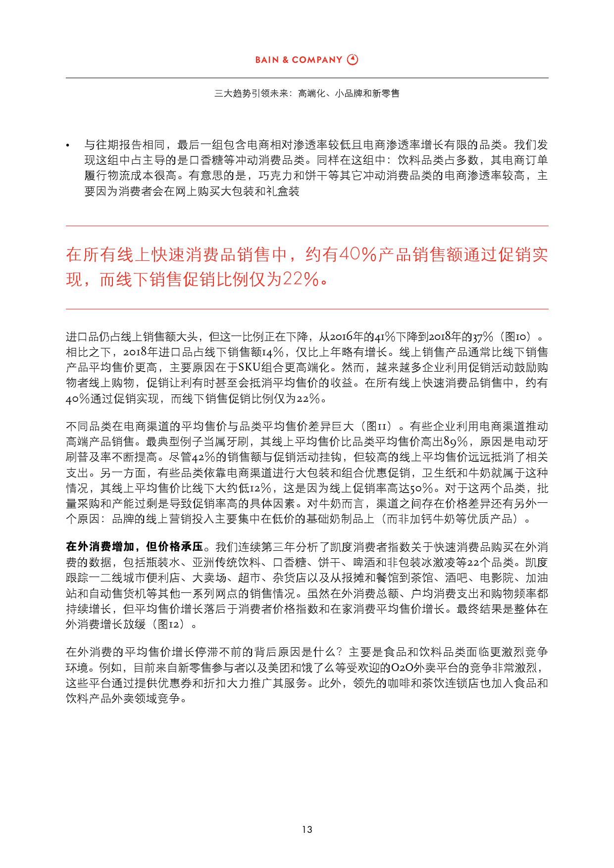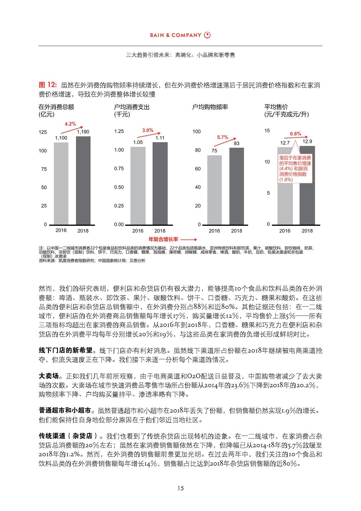 尽管2018年不一定是个转折点,但研究显示,线下零售确实开始出现转机。此前,随着电商渠道的迅速崛起,大多数实体店业态的市场份额一直在逐步下滑。但如今,线下零售商有机会通过更小更灵活的业态,突破低迷,恢复增长势头。例如,基于研究中分析的10个食品和饮料品类,我们发现,自2016年以来,在传统渠道(杂货店),在外消费食品和饮料销售额的复合年均增长率为14%, 2018年占传统渠道总销售额的80%。同样这10个品类,在外消费也推动了其在便利店销售额的增长,过去两年,在外消费商品销售额复合年均增长17%,占便利店总销售额的88%。
