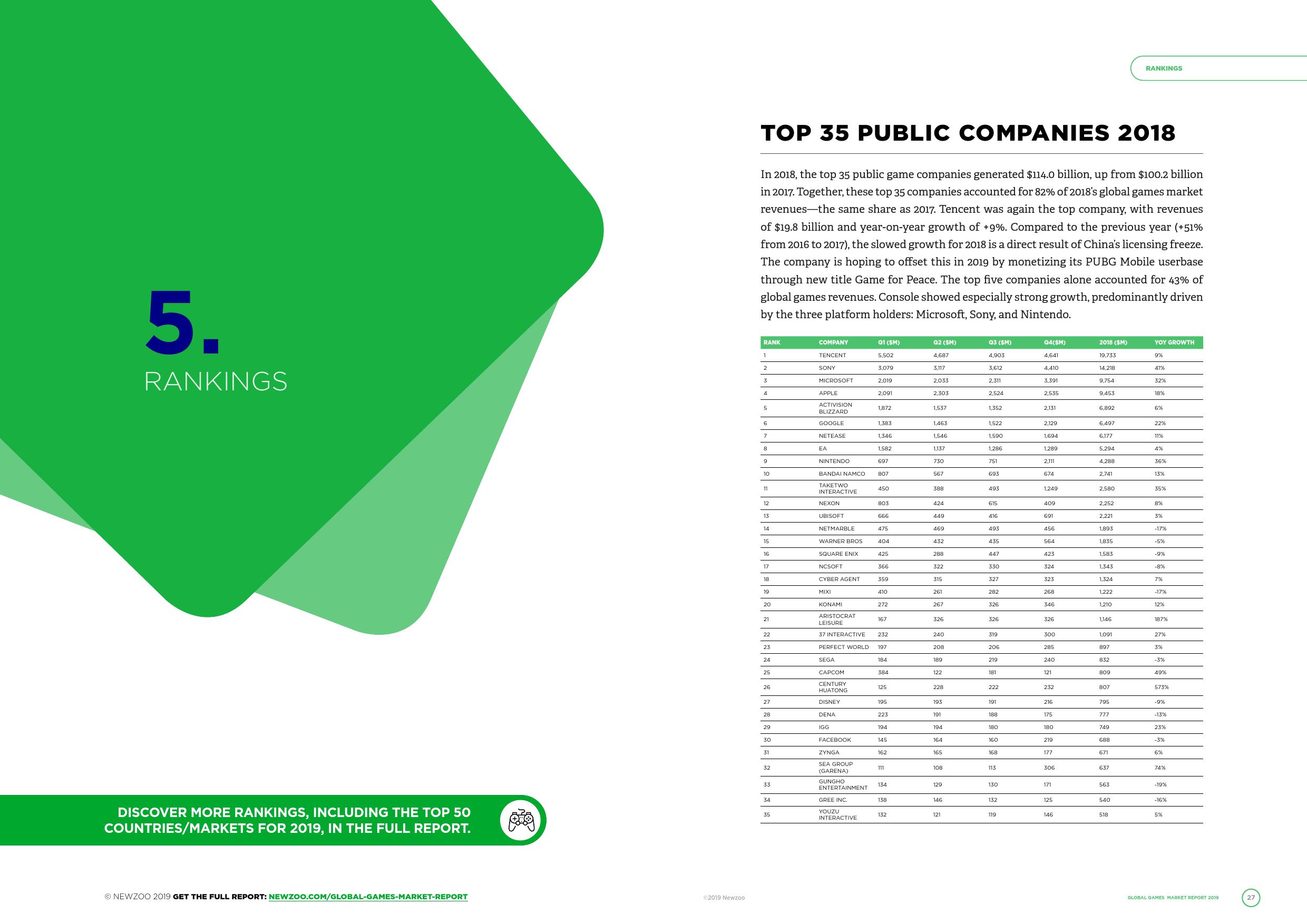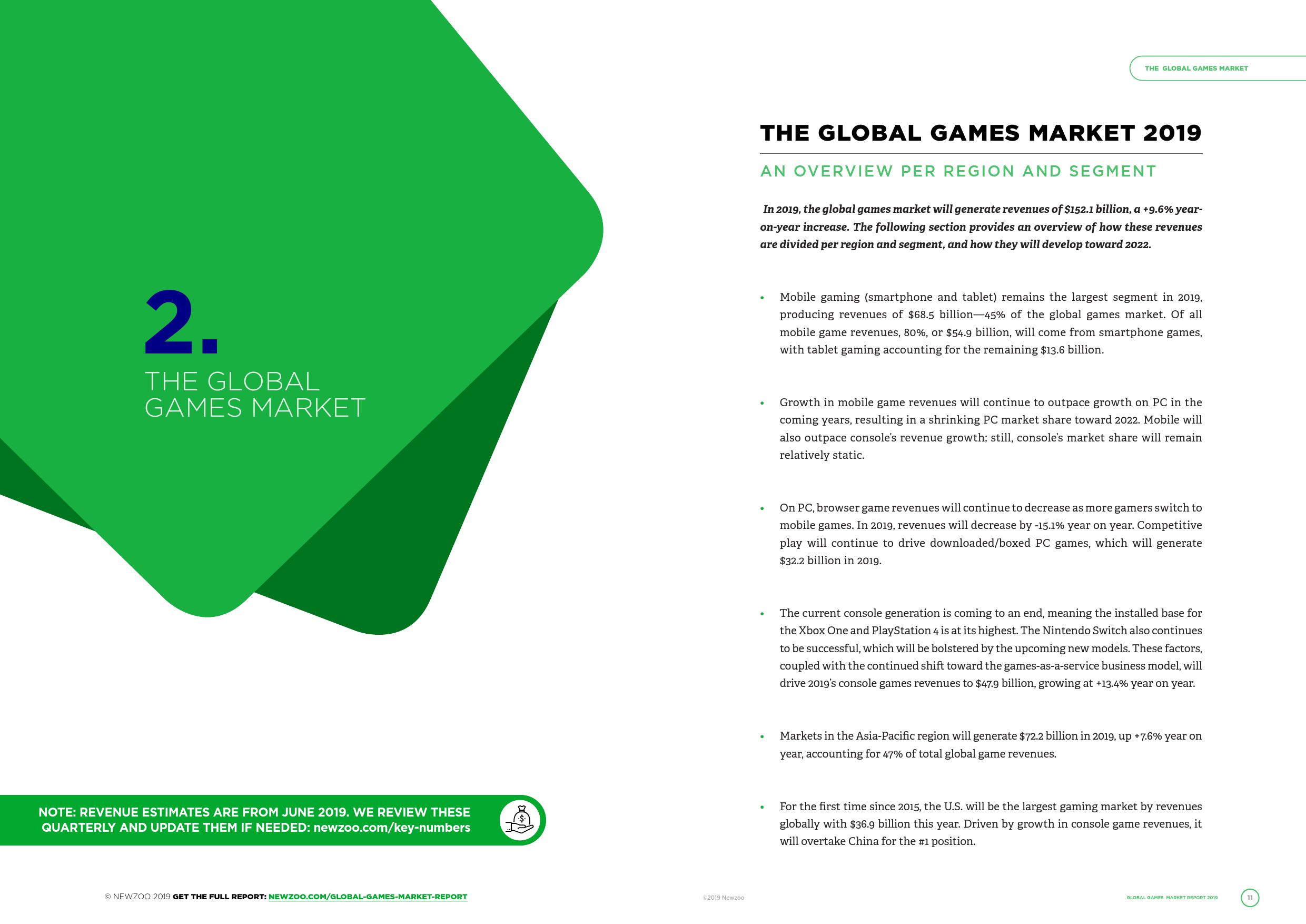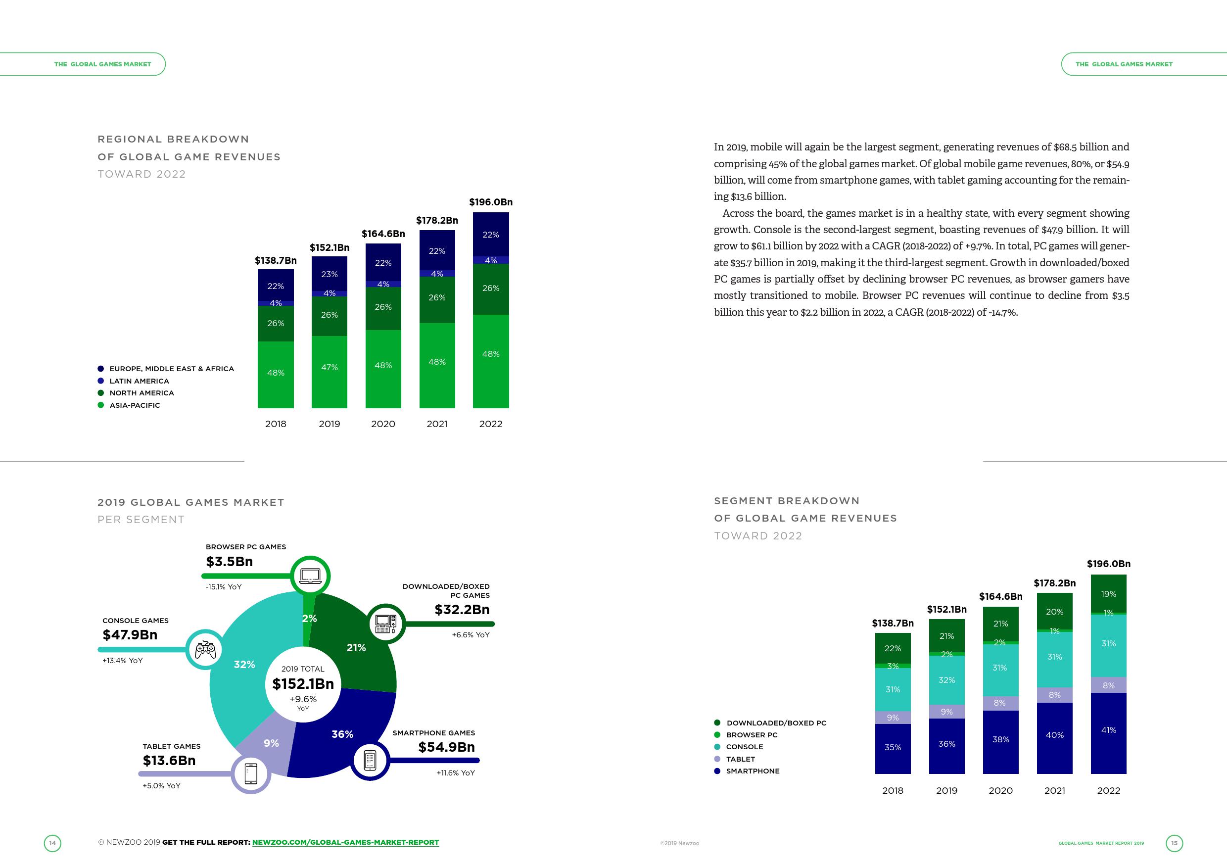 Newzoo 发布了《2019年全球游戏市场报告》,并在报告中指出移动端游戏在2019年将仍是最大的细分市场,占据全球游戏市场规模的45%。全球移动游戏收入中的80%,其高增速也将导致PC游戏市场份额将持续缩减,不过主机游戏的市场份额并不会产生太大的变动。