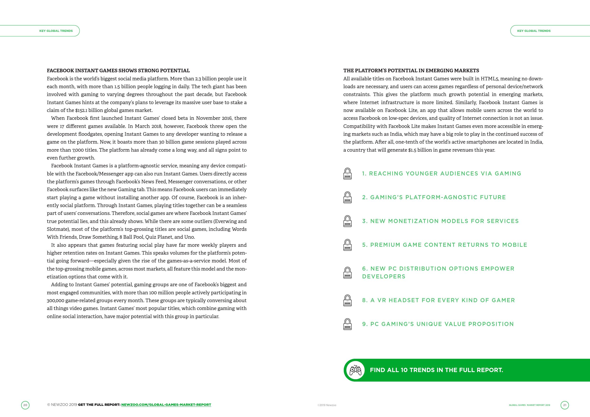 2019年,全球游戏市场预计将产生1521亿美元的收入,年同比增长9.6%。移动游戏(智能手机及平板电脑)在2019年将仍是最大的细分市,产生685亿美元的市场收入——占据全球游戏市场规模的45%。对PC游戏而言,由于越来越多玩家转向了移动端,网页游戏的市场收入会继续下滑。2019年,其市场规模年同比将缩减15.1%。竞技类游戏将继续拉动数字版/盒装PC游戏的销量,在2019年带来322亿美元的收入。