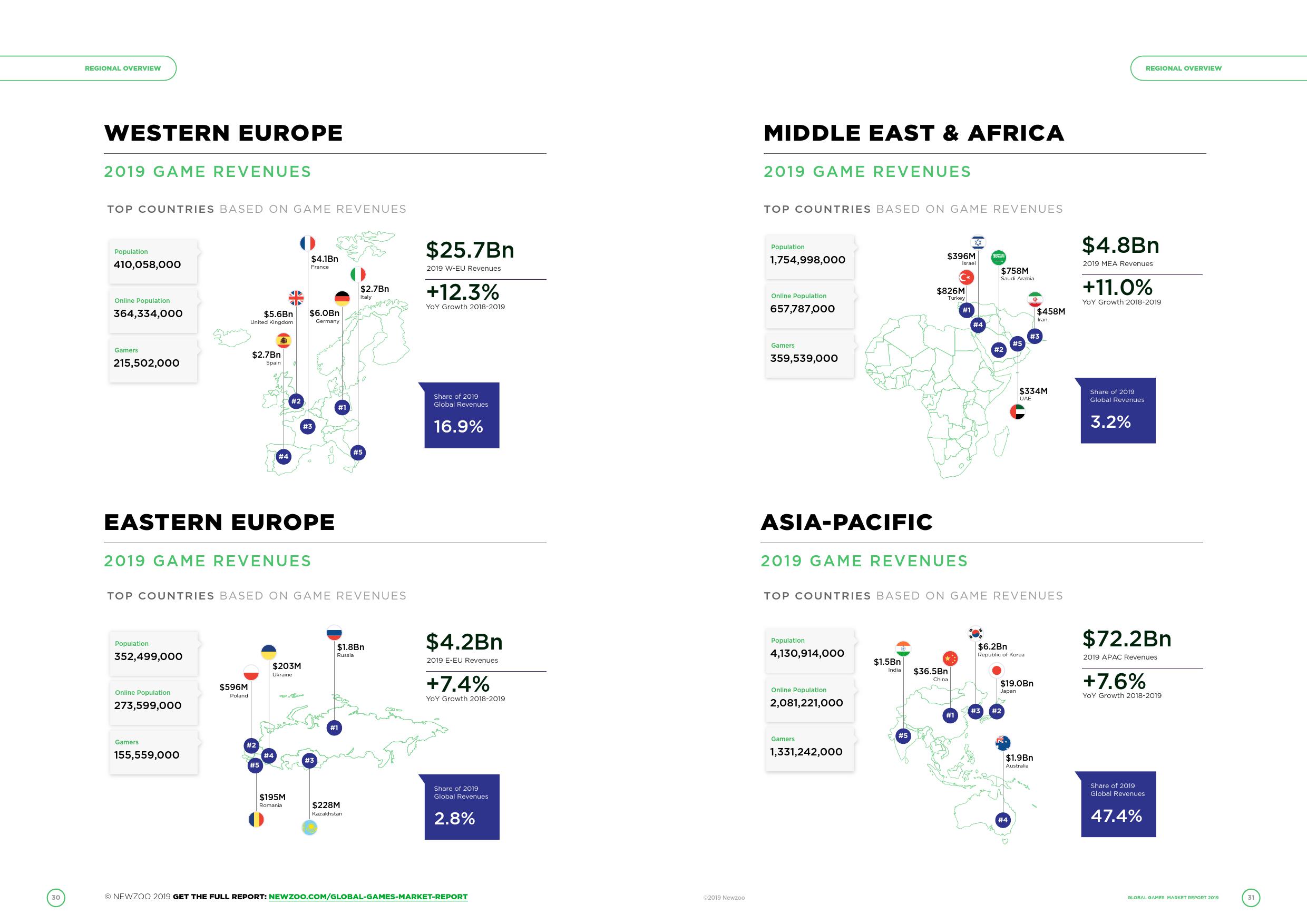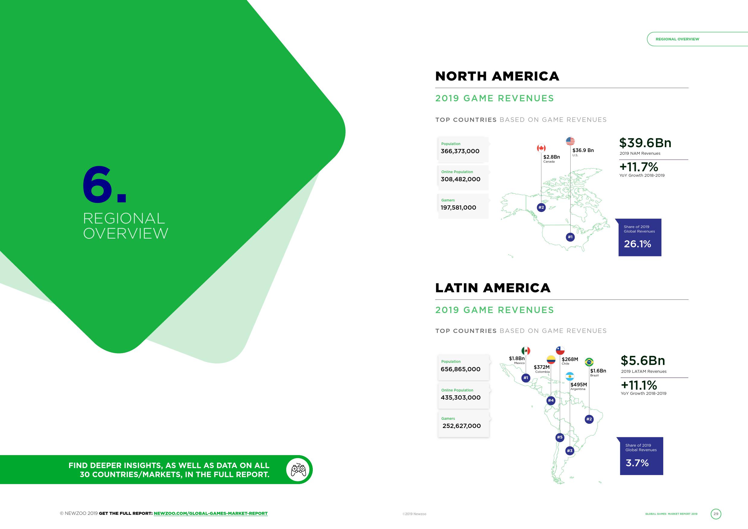 而北美地区则将蝉联(游戏收入)第二大地区,今年收入将达到396亿美元,占2019年全球游戏市场规模的四分之一以上(26%)。这一收入数据与去年相比增长了11.7%,在所有地区的年同比增速中排行第一。