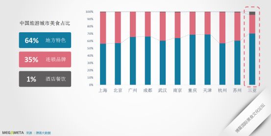 综合全国众多旅游城市的美食占比,64%为地方特色,35%为连锁品牌,剩余1%为酒店餐饮。其中,在三亚、重庆和天津等本土餐饮特色明显的城市,地方特色美食占比尤其拔高。