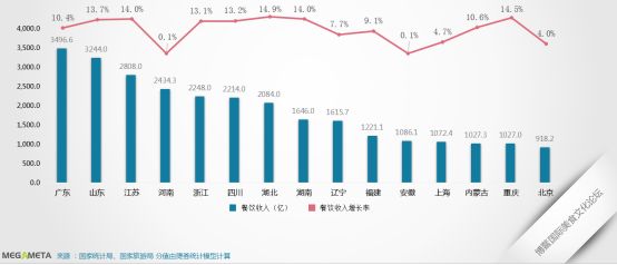 在各省区餐饮收入排行上,广东省以3496.6亿元排名第一,其次是山东省、江苏省。