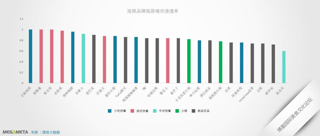值得一提的是,正新鸡排、麦当劳、肯德基的品牌渗透率均为100%,在全国TOP50旅游城市均已有布局。