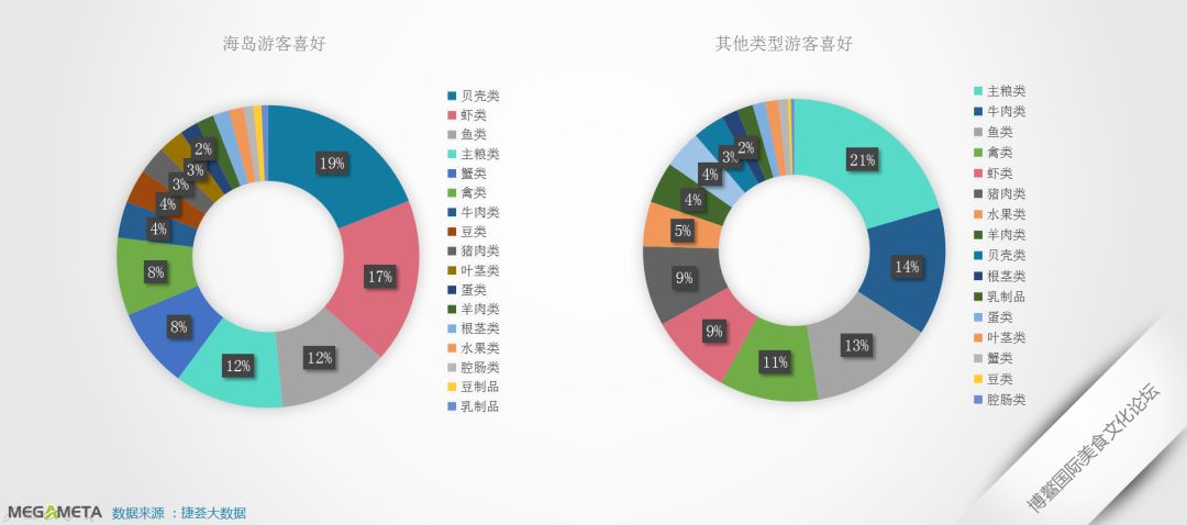 此外,在喜好上,国内游客普遍喜欢的食物仍以主粮类(包含米粉、面食)为主,海岛游客则偏向于海鲜类,因此贝壳、虾类、鱼类占比位居前三。