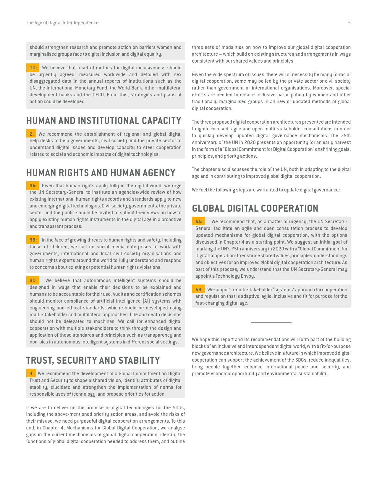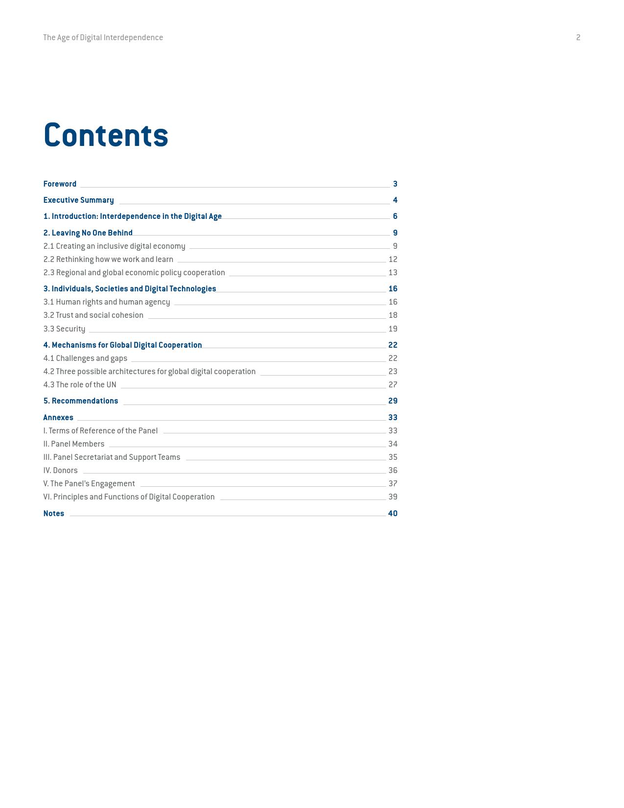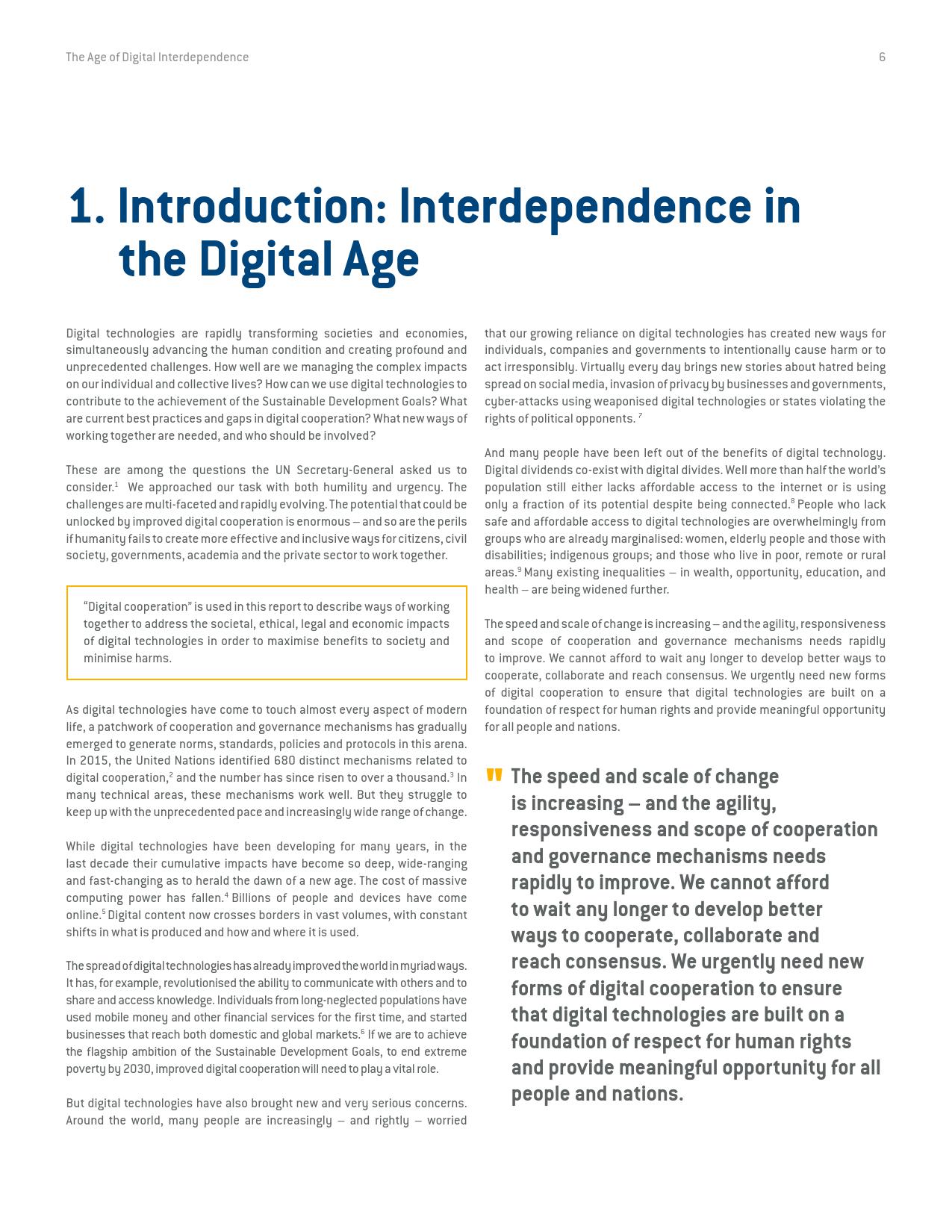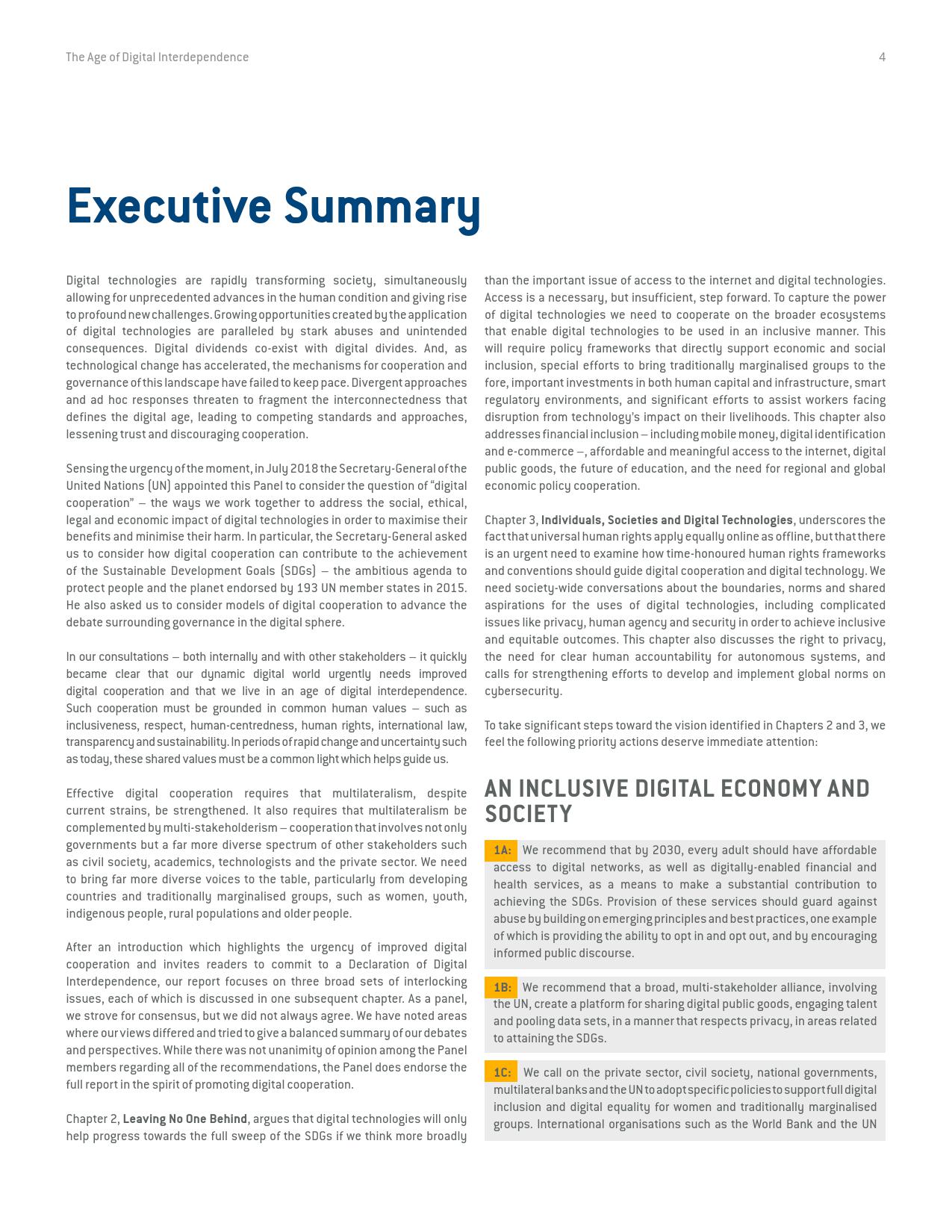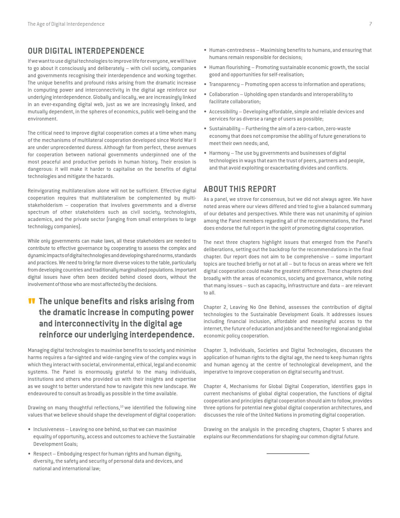 《数字相互依存的时代——联合国数字合作高级别小组报告》的报告分三个主要部分:1)数字技术如何支持实现可持续发展目标以及如何确保更具包容性的数字经济的前景;2)审查与数字领域、人的代理关系和安全有关的问题;3)数字合作模式。