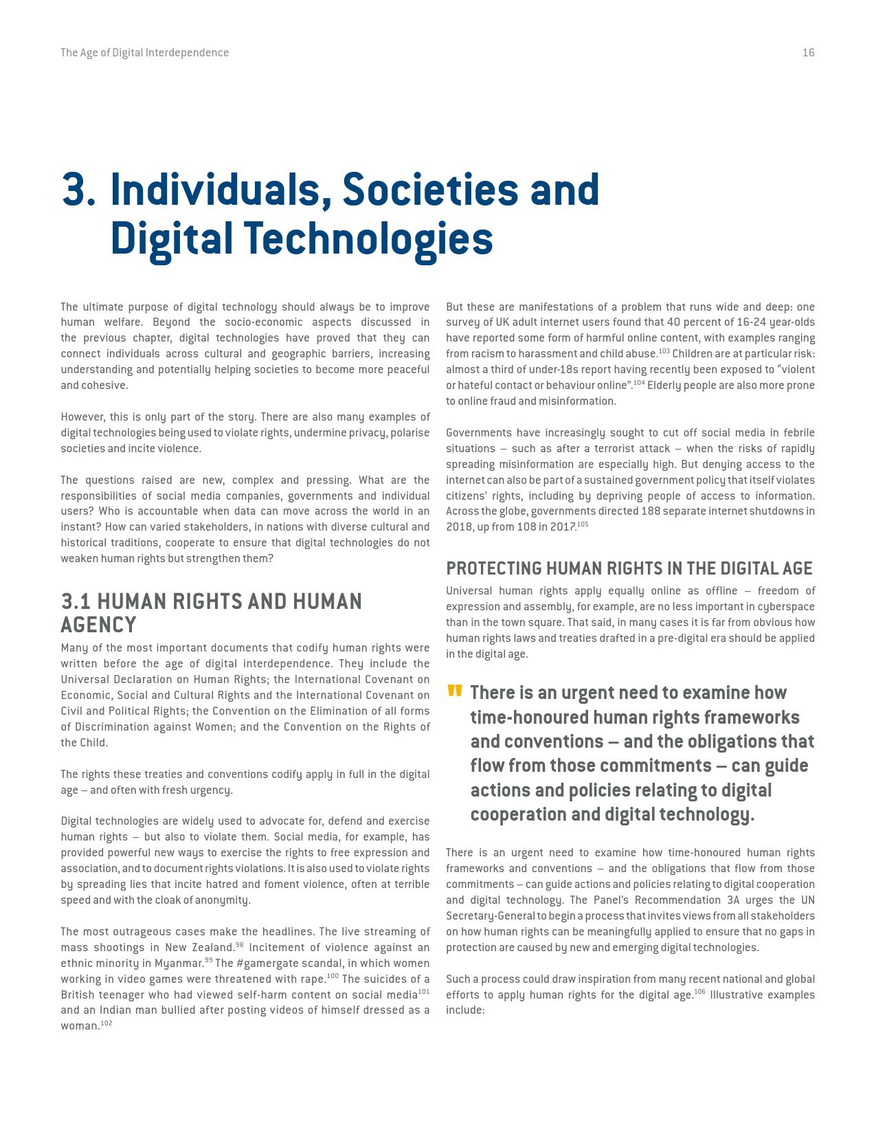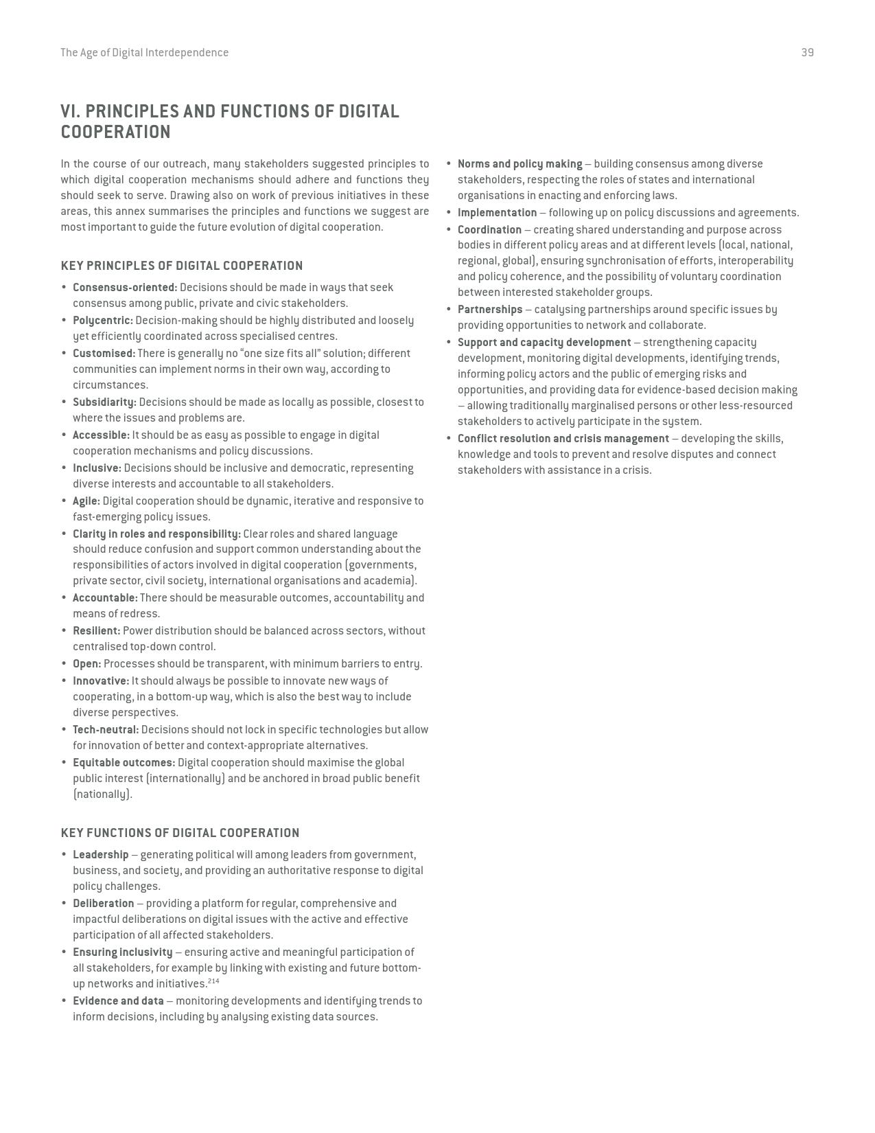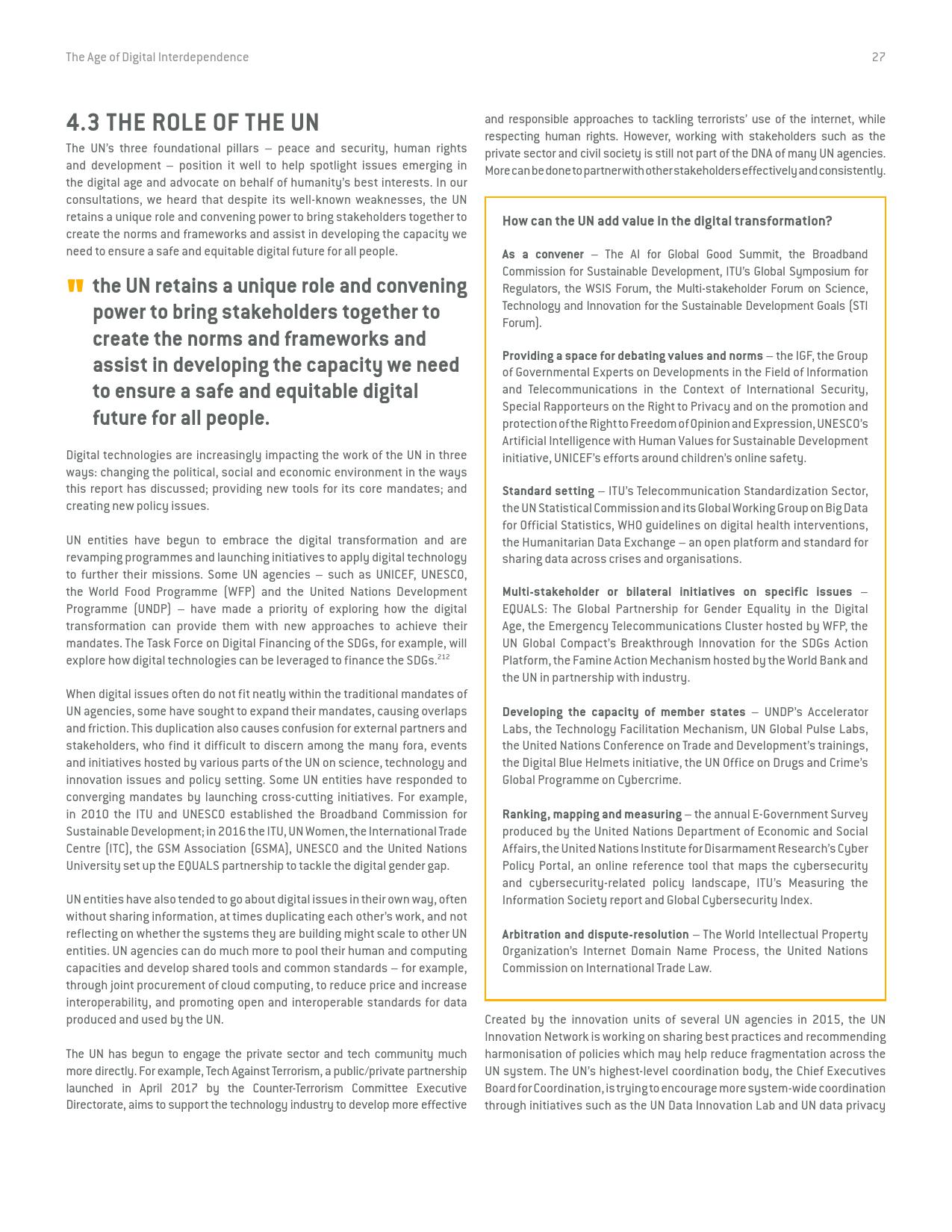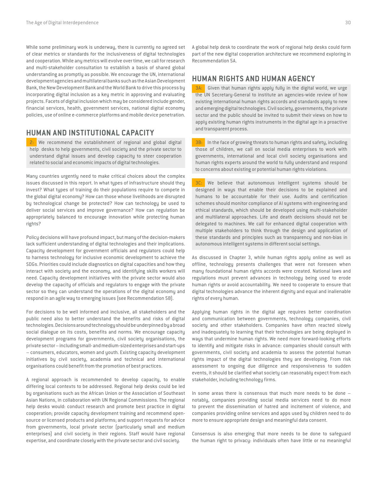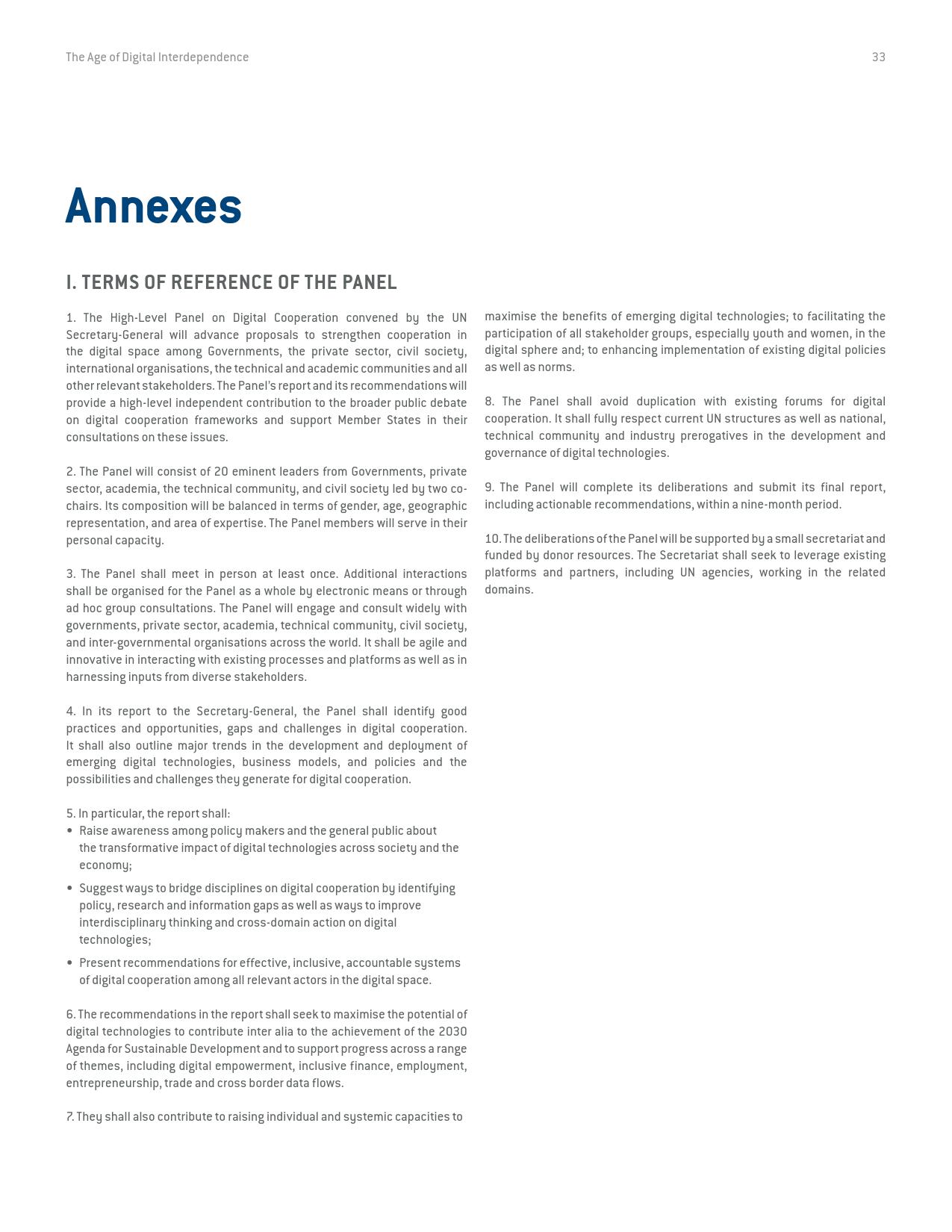 《数字相互依存的时代——联合国数字合作高级别小组报告》的报告分三个主要部分:1)数字技术如何支持实现可持续发展目标以及如何确保更具包容性的数字经济的前景;2)审查与数字领域、人的代理关系和安全有关的问题;3)数字合作模式。