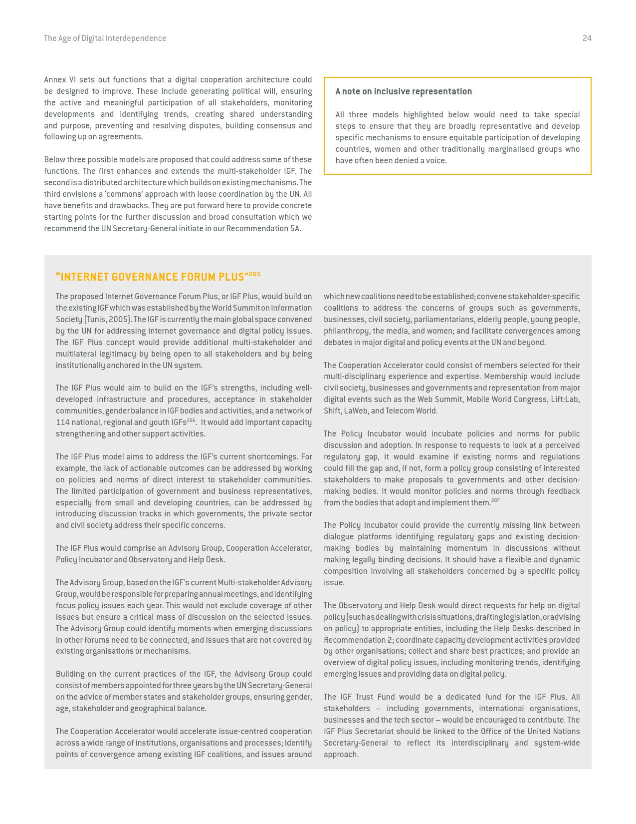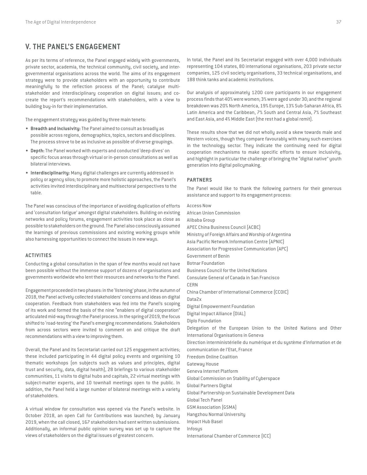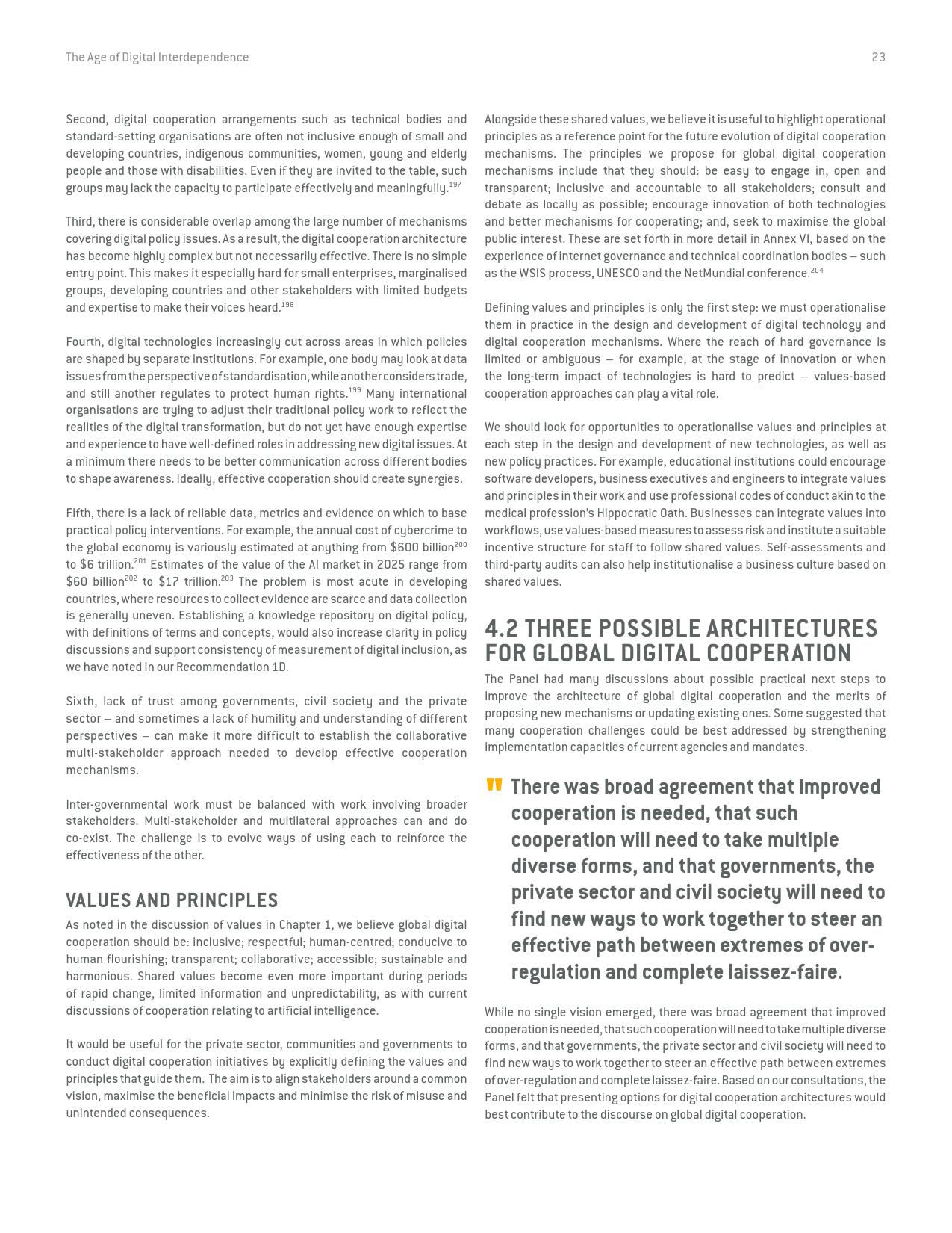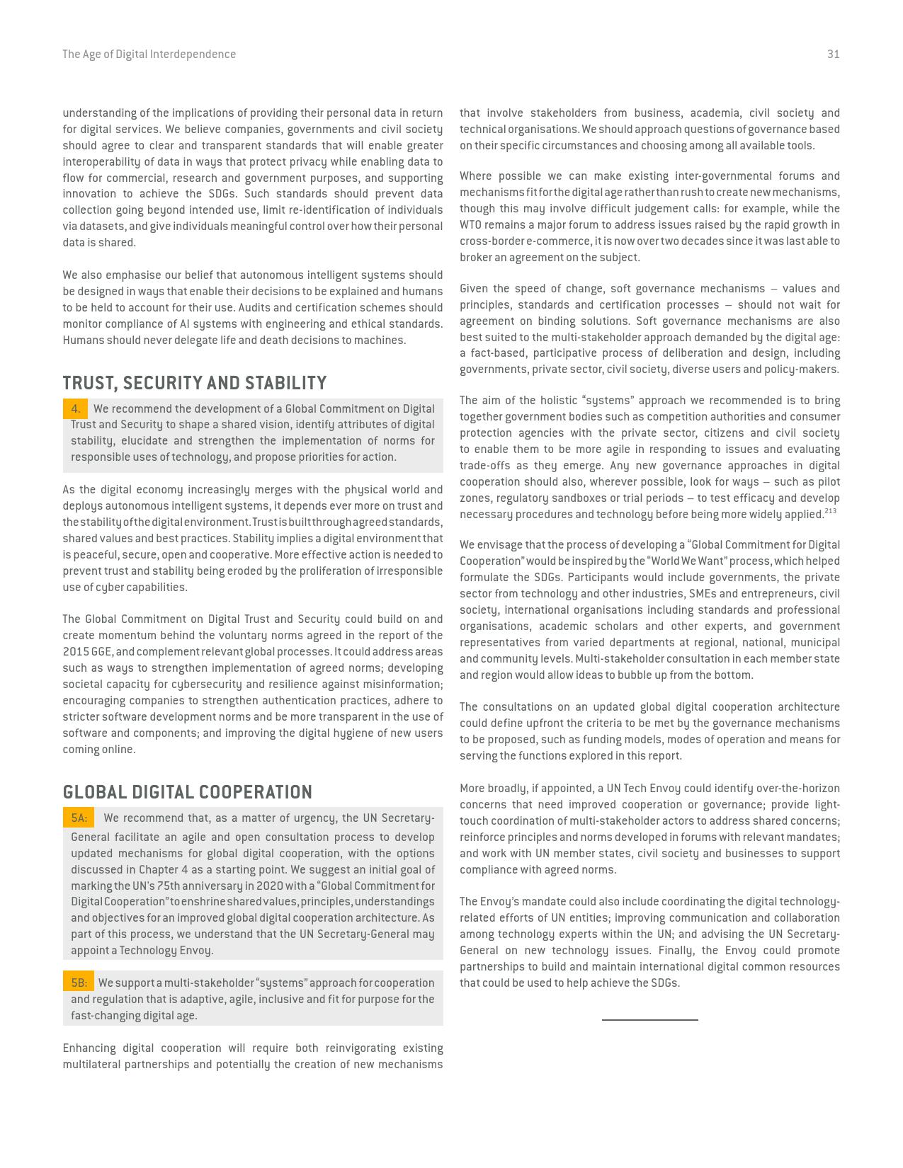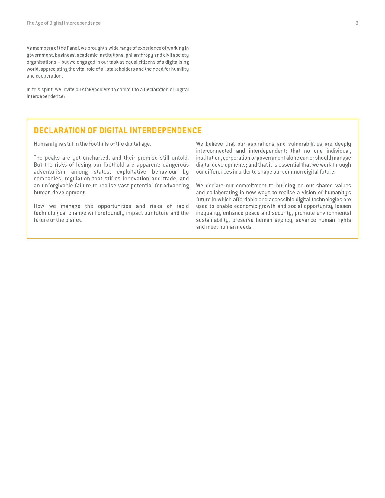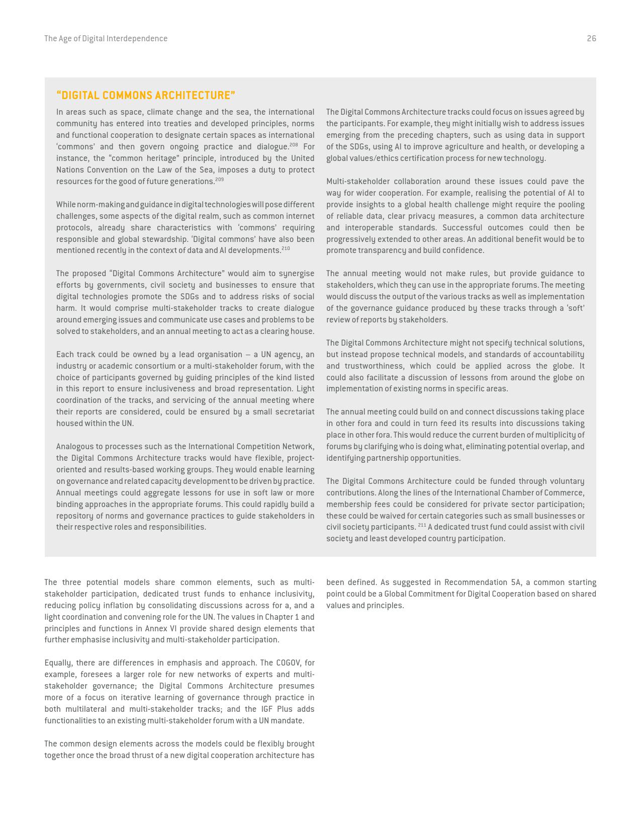《数字相互依存的时代——联合国数字合作高级别小组报告》的报告分三个主要部分:1)数字技术如何支持实现可持续发展目标以及如何确保更具包容性的数字经济的前景;2)审查与数字领域、人的代理关系和安全有关的问题;3)数字合作模式。