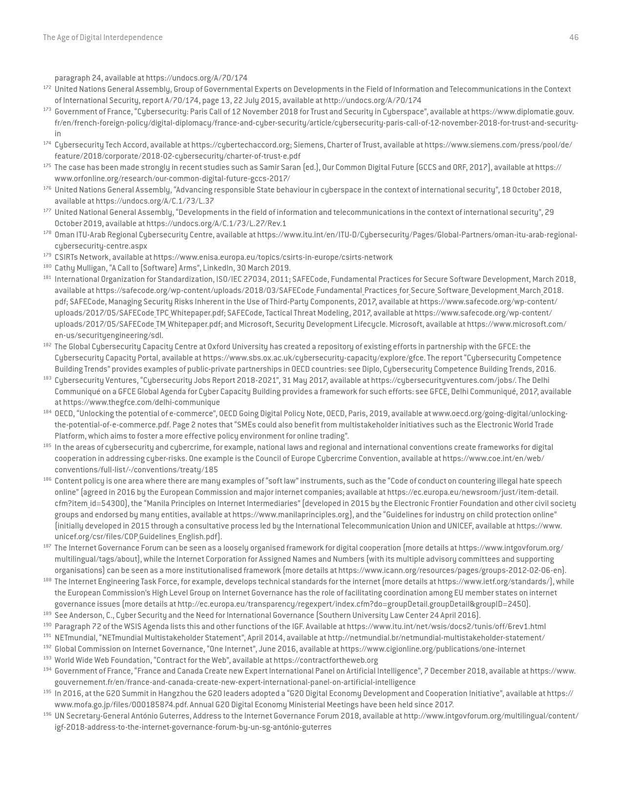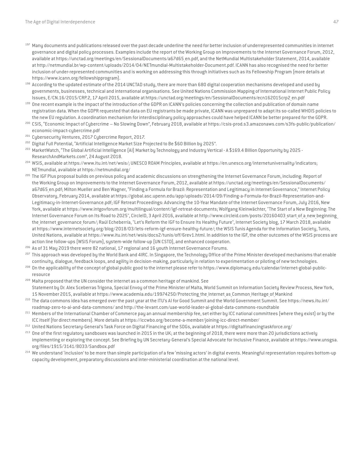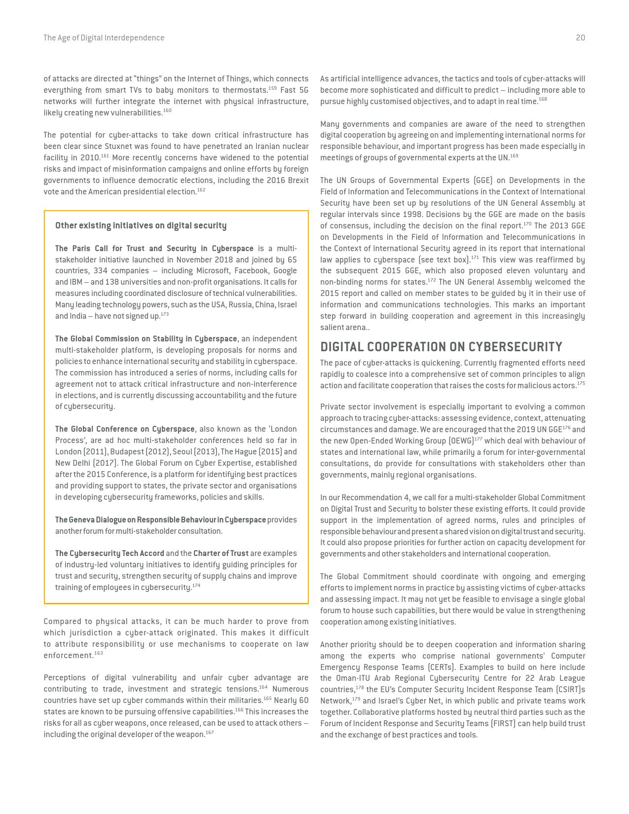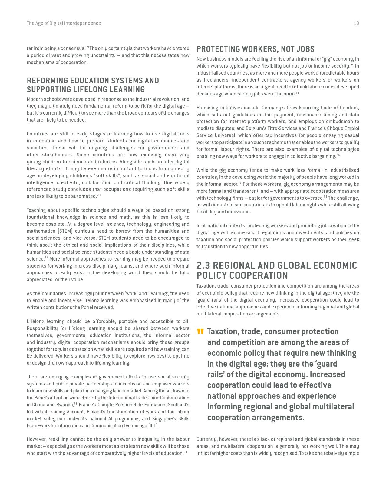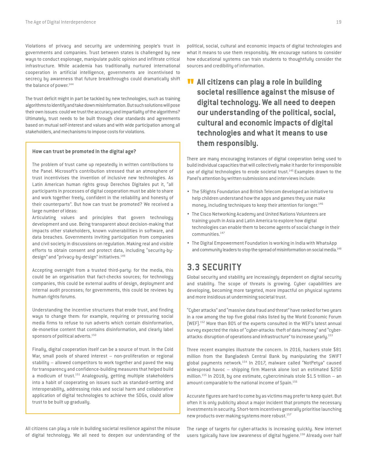 《数字相互依存的时代——联合国数字合作高级别小组报告》的报告分三个主要部分:1)数字技术如何支持实现可持续发展目标以及如何确保更具包容性的数字经济的前景;2)审查与数字领域、人的代理关系和安全有关的问题;3)数字合作模式。
