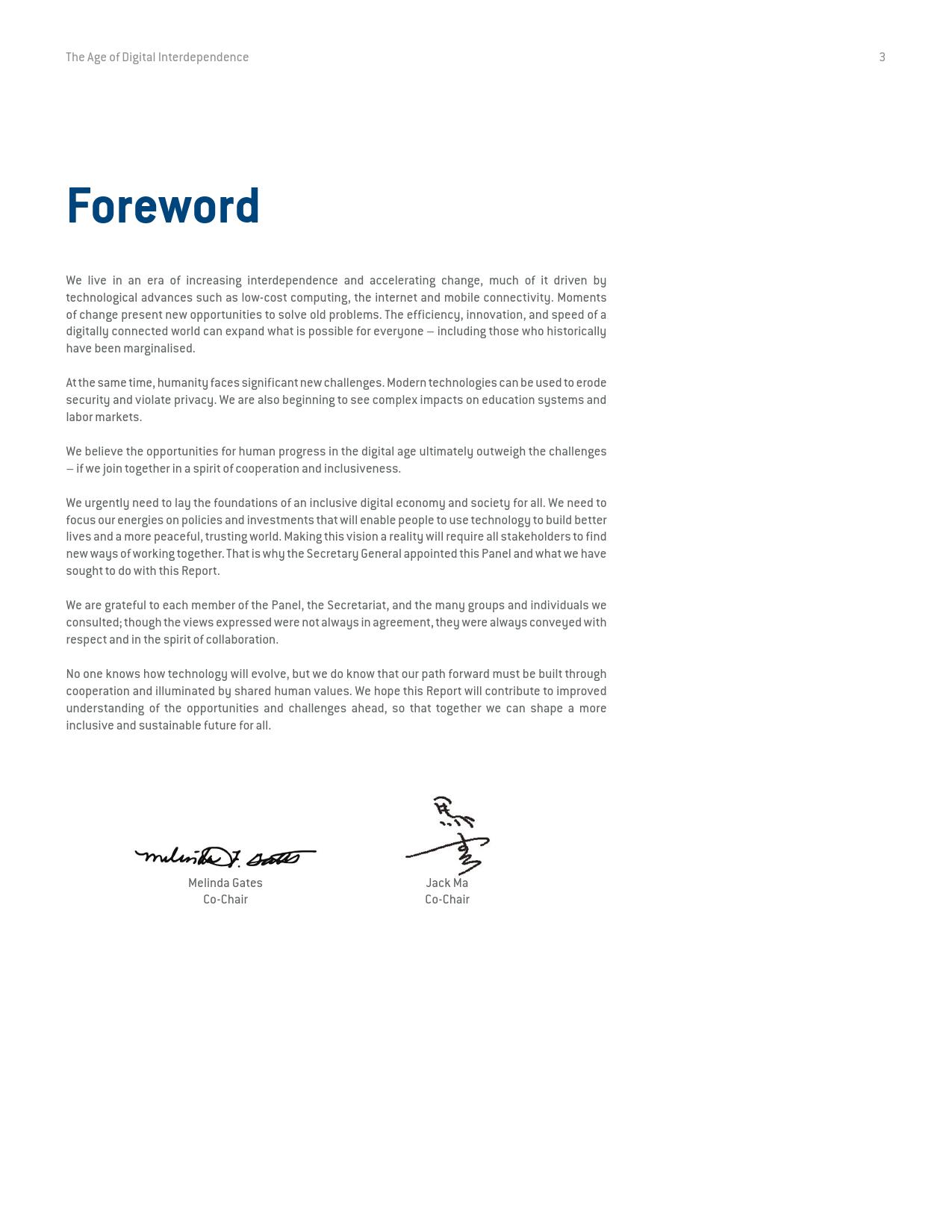 比尔及梅琳达·盖茨基金会共同主席梅琳达·盖茨、阿里巴巴集团执行主席马云和联合国秘书长安东尼奥·古特雷斯共同出席《相互依存的数字时代》报告发布会。