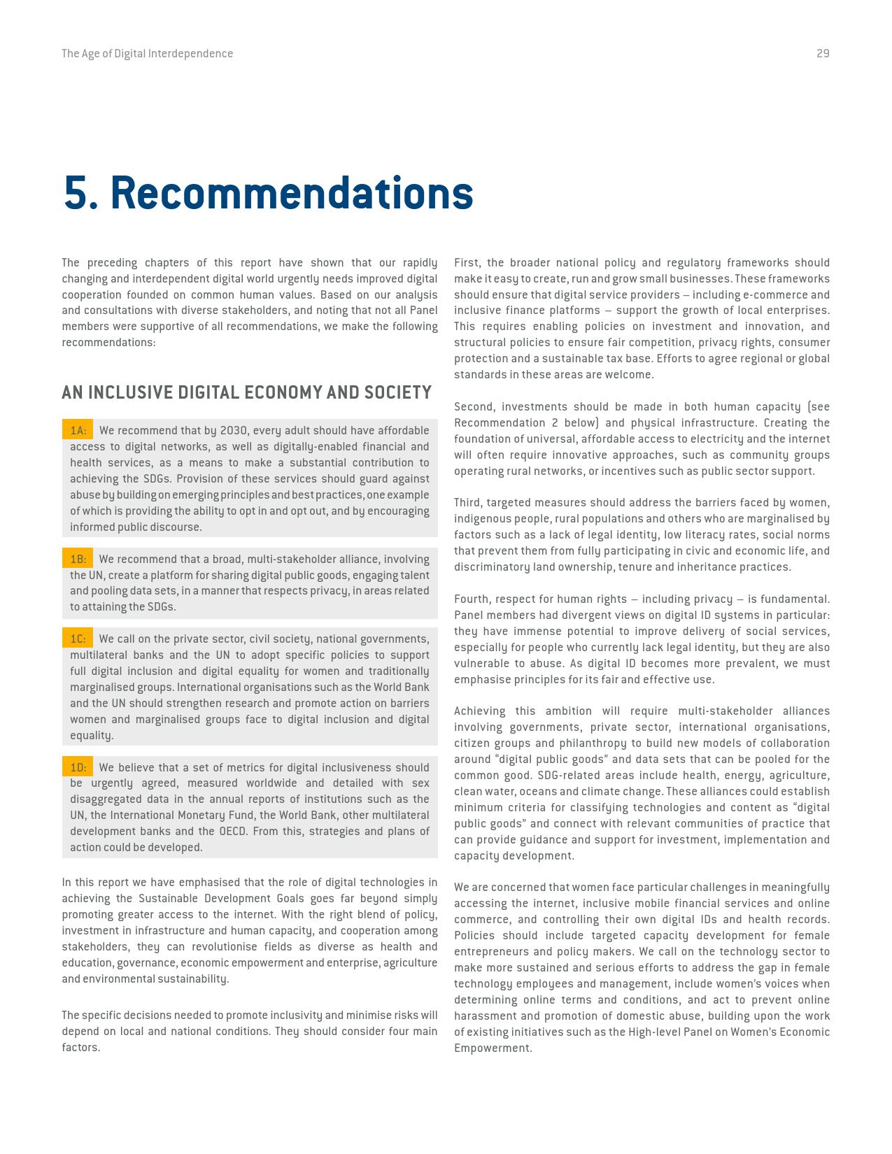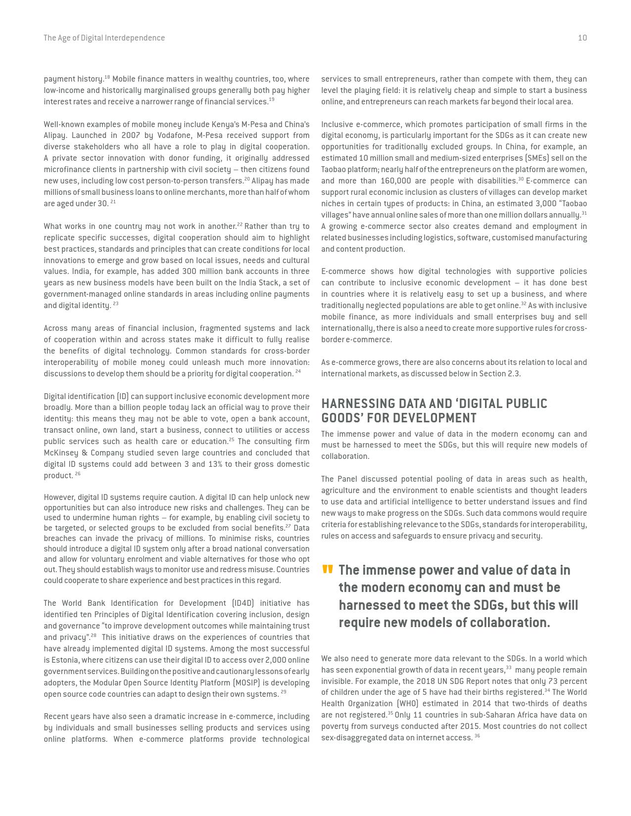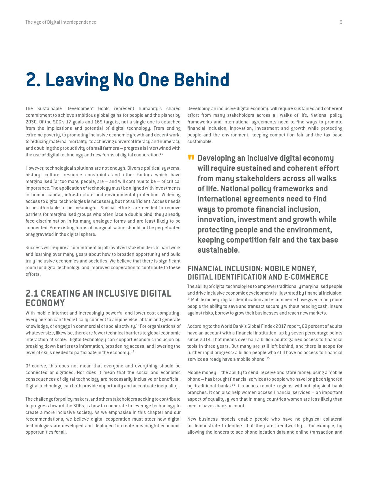 联合国秘书长数字合作高级别小组在经过长达9个月的磋商和论证后于今天发表了它的研究报告《数字相互依存的时代——联合国数字合作高级别小组报告》(the age of digital interdependence)。报告呼吁建设包容性数字经济和社会,到2030年,确保每个成年人都能获得可负担得起数字网络,以及数字金融和医疗服务,建立广泛的多方利益攸关方联盟,为实现可持续发展目标共同分享“数字公共产品”和数据。