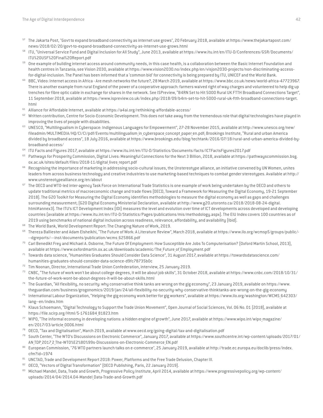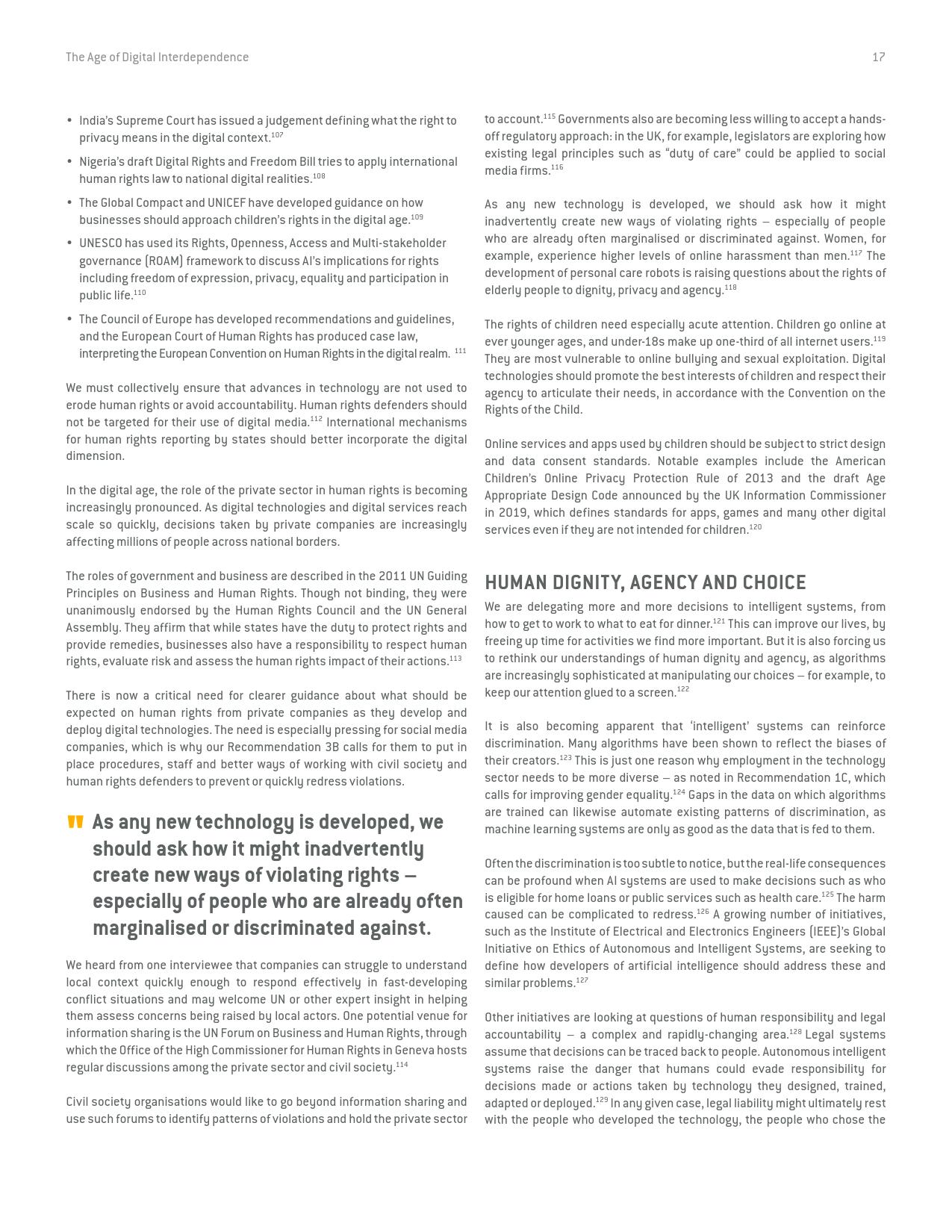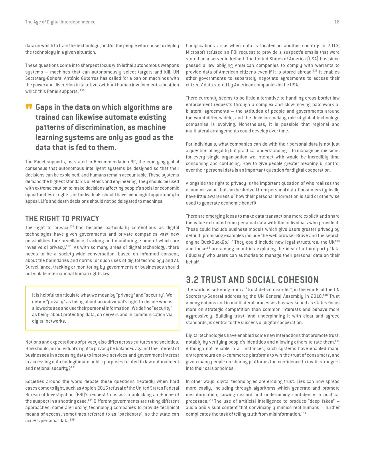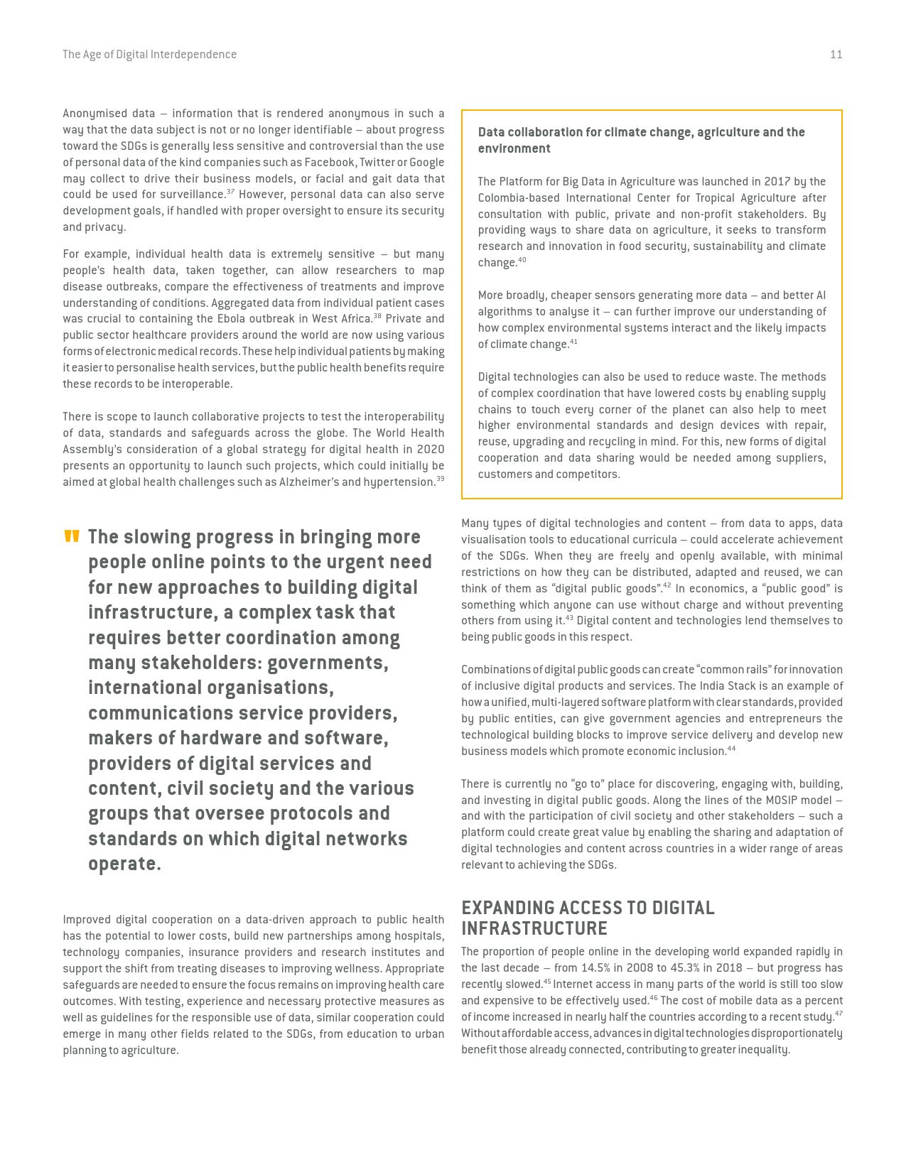 联合国秘书长数字合作高级别小组在经过长达9个月的磋商和论证后于今天发表了它的研究报告《数字相互依存的时代——联合国数字合作高级别小组报告》(the age of digital interdependence)。报告呼吁建设包容性数字经济和社会,到2030年,确保每个成年人都能获得可负担得起数字网络,以及数字金融和医疗服务,建立广泛的多方利益攸关方联盟,为实现可持续发展目标共同分享“数字公共产品”和数据。