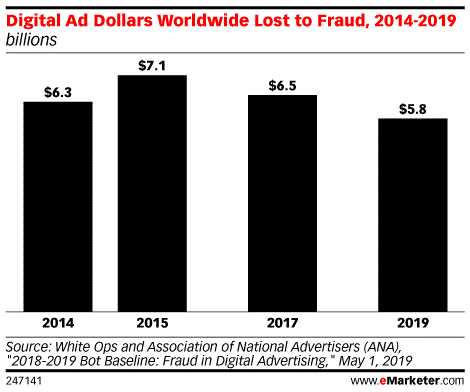 2019年5月,反欺诈供应商White Ops和广告行业组织全国广告商协会(ANA)的研究表明,今年因广告流量欺诈将损失58亿美元,低于2017年的65亿美元。