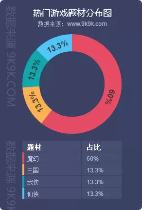 综述:本月热门游戏中有魔幻、三国、武侠、仙侠等四种题材游戏,目前较火的新游《龙权天下》为三国题材,还有两款热游《灭神》、《猛将天下》为魔幻题材;在画面上则依旧是2D画面为主,3D画面比例进一步上升。新游方面基本与上月保持一致。