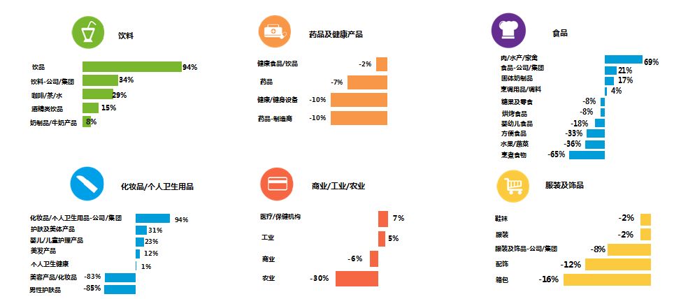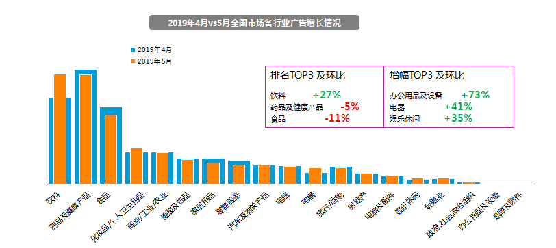 尼尔森网联AIS全媒体广告监测显示,2019年5月各行业投放花费总量排名前三的分别是饮料、药品及健康产品、食品;其中,饮料行业同比增长27%;药品及健康产品同比下降5%,食品行业同比下降11%。全行业增幅榜前三的行业为办公用品及设备、电器、娱乐休闲,同比增幅分别为73%、41%、35%。5月,各种原因导致的“食品涨价”成为经济、社会新闻热点;食品行业的广告投放也为行业所关注。整体上,食品行业在5月的投放虽然有所下降,但与排名第四的化妆品/个人卫生用品行业相比,在投放量方面具有绝对优势,是重点投放行业之一。