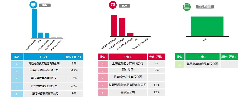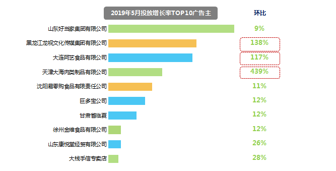 广告主方面,环比增长率排名前三的分别是天津大海肉类制品有限公司、黑龙江龙视文化传媒集团有限公司、大连阿艺食品有限公司;三大广告主均为本土企业,它们的环比增长率均大于1,带动了整个肉类(新鲜/冷冻/罐装)产品的增长。5月增长率top10中,水产类(新鲜/冷冻/罐装)企业占有5个席位;花费排名前三的企业均为水产类(新鲜/冷冻/罐装)。这为5月份整体下降27%的水产类(新鲜/冷冻/灌装)蕴藏着些许回暖的机会。