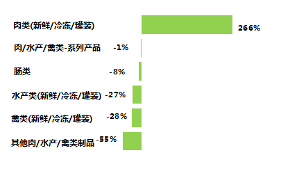 肉/水产/家禽的子小类中,肉类(新鲜/冷冻/罐装)子小类增幅最大,远超其他子小类,达266%。随着生活水平的提高,肉类食品的品种逐渐丰富;在消费者对肉制品的追求由温饱向品质、安全的小康型转变过程中,相关广告主也在加大品牌及推广预算。相比于欧美发达国家,目前,我国健康、营养和新鲜度高的冷鲜肉市场的发展空间十分可观。5月,肉类(新鲜/冷冻/罐装)子小类取得了阶段性的大幅增长,这既是由于五一假日的影响,也得益于相关市场对6月端午佳节的销售预热。