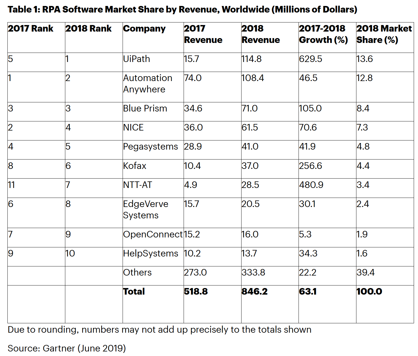 2018年,排名前五为的RPA供应商占47%的市场份额。排名第六和第七的供应商实现了三位数的收入增长(见表1)。这使得五强排名非常不稳定。”