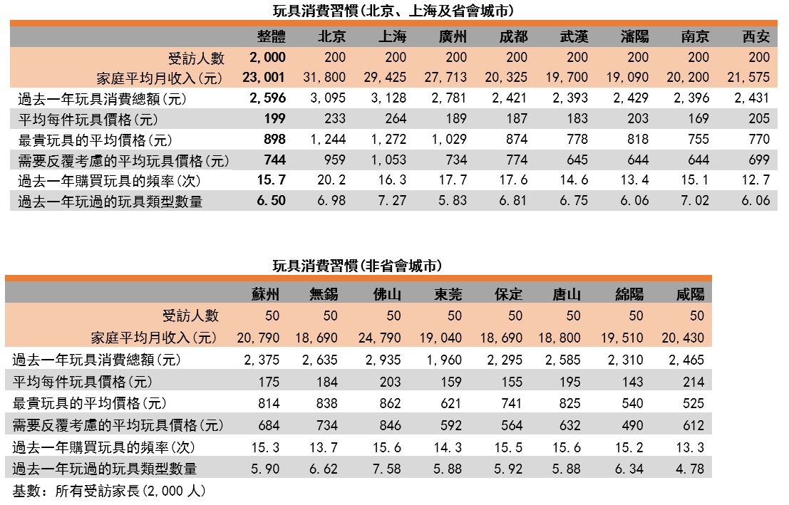 各城市受访家长在玩具方面的消费力越趋平均,受访家长过去一年的玩具平均消费约2,000-3,000元之间。当中以上海受访家长在这次调查中的消费力最高,过去一年的玩具消费总额(3,128元)、平均每件玩具的价格(264元)、最贵玩具的平均价格(1,272元)及需要反覆考虑的平均价格(1,053元)均是受访城市中最高。