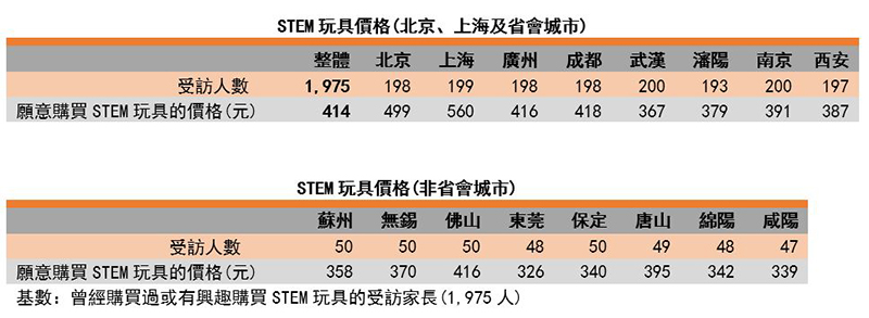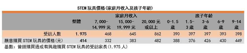STEM玩具[3]广受内地家长接受,在调查中,超过98%受访家长曾经购买过或有兴趣购买STEM玩具。他们愿意购买STEM玩具的平均价格为414元,比一般玩具平均价格(199元) 高108%。收入越高及孩子年龄越大,家长愿意购买STEM玩具的价格越高,价格由约300-500元不等。近年内地也兴起机器人比赛等以STEM教育为主题的活动,让家长对STEM教育更了解及有正面的印象,因此他们愿意在STEM玩具上花费更多。有家长在座谈会上表示:「如果玩具能够协助孩子学习,我愿意为这件玩具付出500元以上。」也有家长表示:「若我要购买一件价格较高的玩具,这件玩具需要有娱乐休闲以外的额外价值。」