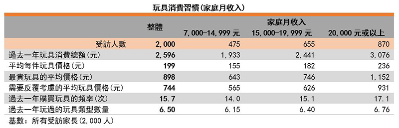 若以家庭月收入区分,受访家庭月收入越高,会花费更多为孩子购买玩具,而最贵玩具的平均价格也较高。但购买玩具的频率和购买玩具的类型数量则差异不大,例如家庭月收入7,000-14,999元的受访家长过去一年购买玩具的频率有14次,而家庭月收入在20,000元以上的购买频率有17次。以上调查结果显示,内地不同家庭月收入的家长均有为孩子购买玩具的习惯。