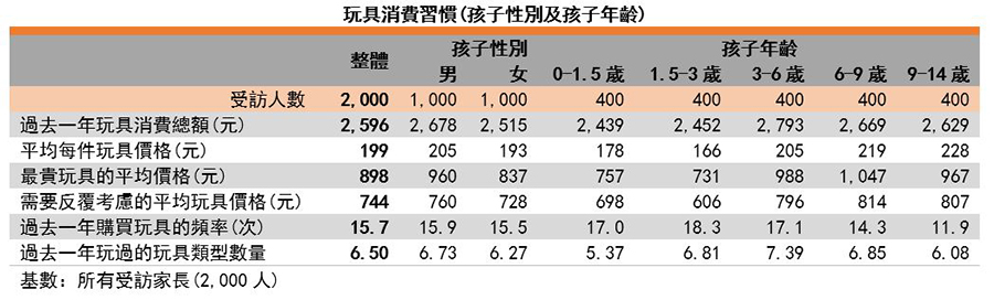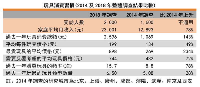 内地家长现时愿意花费更多金钱购买玩具。据调查所得,受访家长过去一年平均花费2,596元为孩子购买玩具,比2014年同类调查的结果上升143%,比同期的家庭月收入的增幅(78%)大。需要反覆考虑的平均玩具价格以及购买玩具频率,分别为744元及每年15.7次,增幅与家庭月收入的增幅大约持平。每件玩具平均价格的增幅比家庭月收入的增幅小,只有49%(平均每件199元)。相反,最贵玩具平均价格的增幅最显著,比2014年上升234%至898元。由此可见,玩具消费总额及平均每件玩具价格上升,主要源于家长愿意为孩子购买更昂贵的玩具,也愿意更频繁地购买玩具。消费者座谈会中一名「80后」家长表示:「我父母会觉得花费1,000元购买一件玩具十分奢侈,但我并不这样认为。两代家长对玩具消费有不同的观念。」