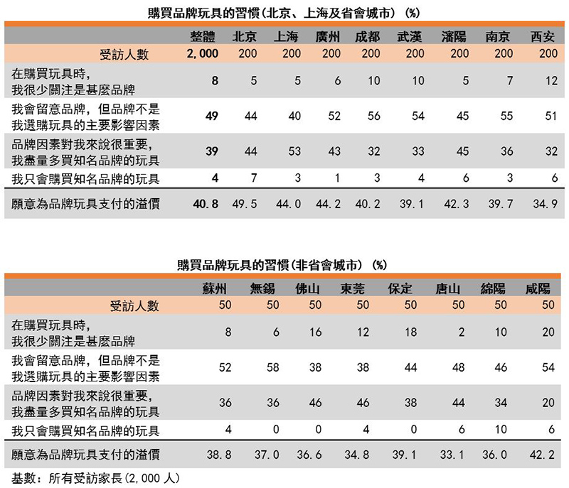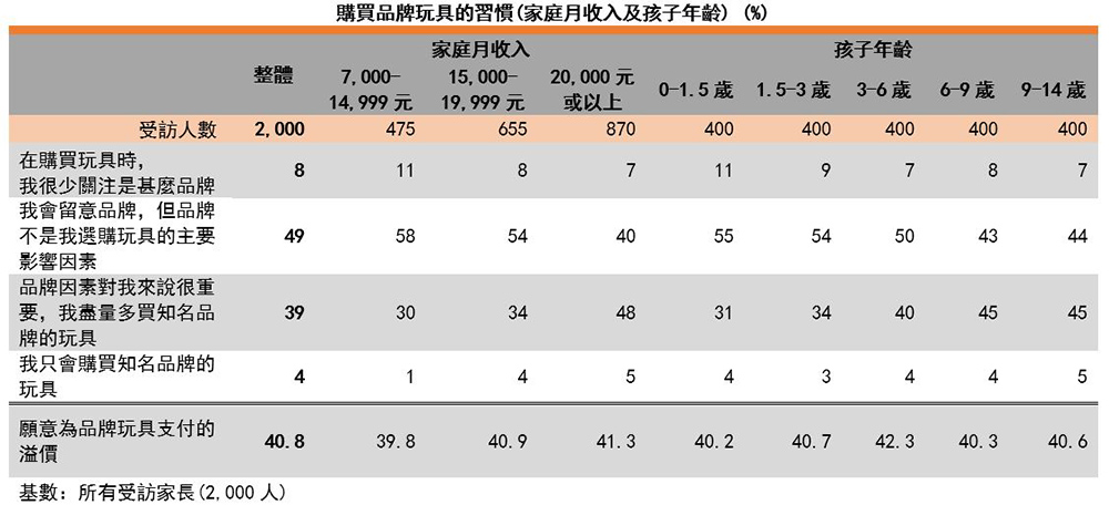 据调查所得,49%受访家长会留意玩具品牌,但品牌并不是选购玩具的主要影响因素。会尽量多购买及只购买知名品牌玩具的受访家长分别有39%及4%。受访家长在选择种类及功能相似的玩具时,愿意为品牌玩具支付的溢价约41%。受访家长购买品牌玩具的习惯受家庭月收入及孩子年龄影响,家庭月收入越高及孩子年龄越大,更多受访家长表示会尽量多购买及只购买知名品牌玩具。消费者座谈会上有家长表示:「年龄较小的孩子对品牌的要求不会太高,因为他们对『品牌』未有概念。孩子年龄较大会开始重视玩具是不是『知名品牌』,因为他们开始与朋辈交流及比较。」然而,收入及孩子年龄并没有显着影响家长对愿意为品牌玩具支付的溢价。