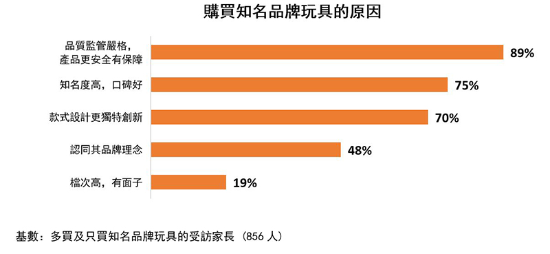 多买及只买知名品牌玩具的受访家长表示,他们认为知名品牌玩具品质监管更严格,因此产品更安全(89%),同时,他们也认为知名品牌玩具款式设计更独特创新(70%)。座谈会中有受访家长表示:「我认为知名品牌的电子玩具比较有品质保证。」也有受访家长表示:「我愿意为玩具的安全及功能支付较高的价格。」