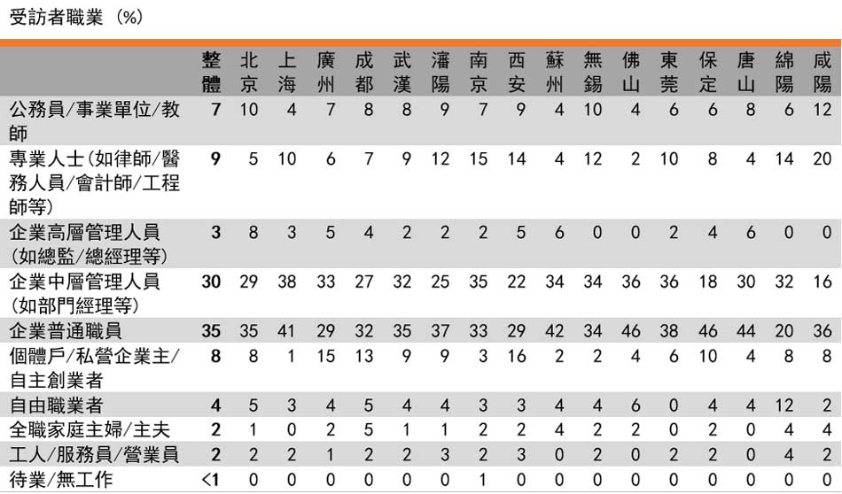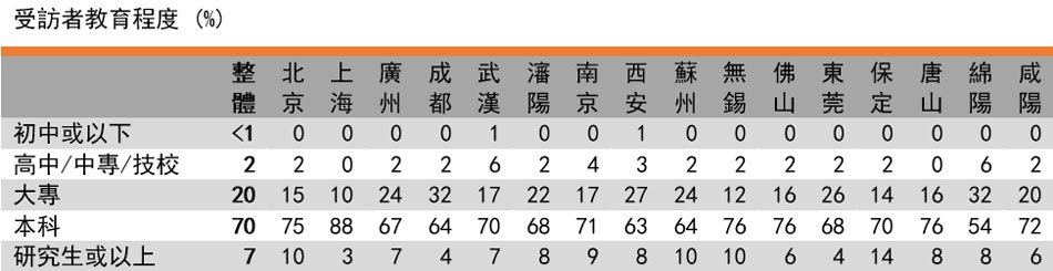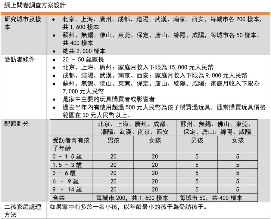 这次调查于2018年10月至12月,向1,600名居住在北京、上海及6个省会城市,及400名居住在8个非省会城市的消费者进行网上问卷调查,共2,000人。在进行问卷调查前,还在上海及成都举行了各2场消费者座谈会及3次家庭深访,希望从定性分析中加深了解内地消费者的消费观念。