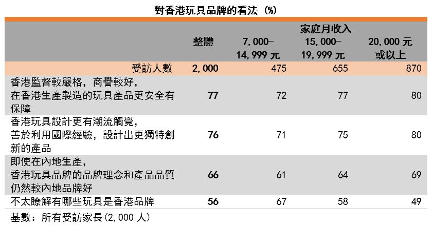 尽管有56%受访家长表示不太了解香港的玩具品牌,但香港玩具品牌形象仍受内地家长青睐。77%受访家长认为,香港监督较严格,商誉较好,在香港生产制造的玩具产品更安全。另外,76%受访家长认为,香港玩具设计师更有潮流触觉。他们能够利用国际经验,设计出更独特创新的产品。也有66%受访家长认为,即使产品在内地生产,香港玩具品牌的品牌理念和产品品质仍然较内地品牌好。调查显示,收入越高的家长,对香港玩具品牌有更多的认同。