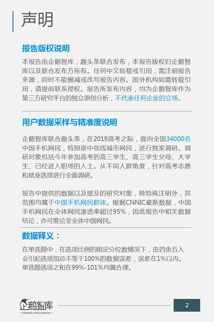 企鹅智库联合趣头条,在2019年高考之际,面向全国34000名中国手机网民,特别是中低线城市网民,包括今年参加高考的高三学生、高三学生父母、大学生、已经进入职场的人士,从不同人群角度,针对高考志愿和就业选择,做一次严肃的调研,希望从多人群角度的回答中,给中国高考以及关心高考的人群一个更为真实的答案。