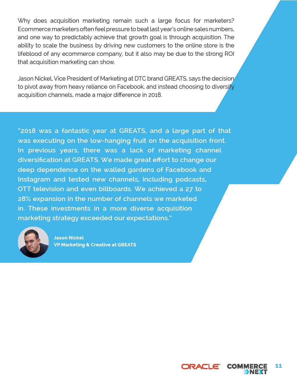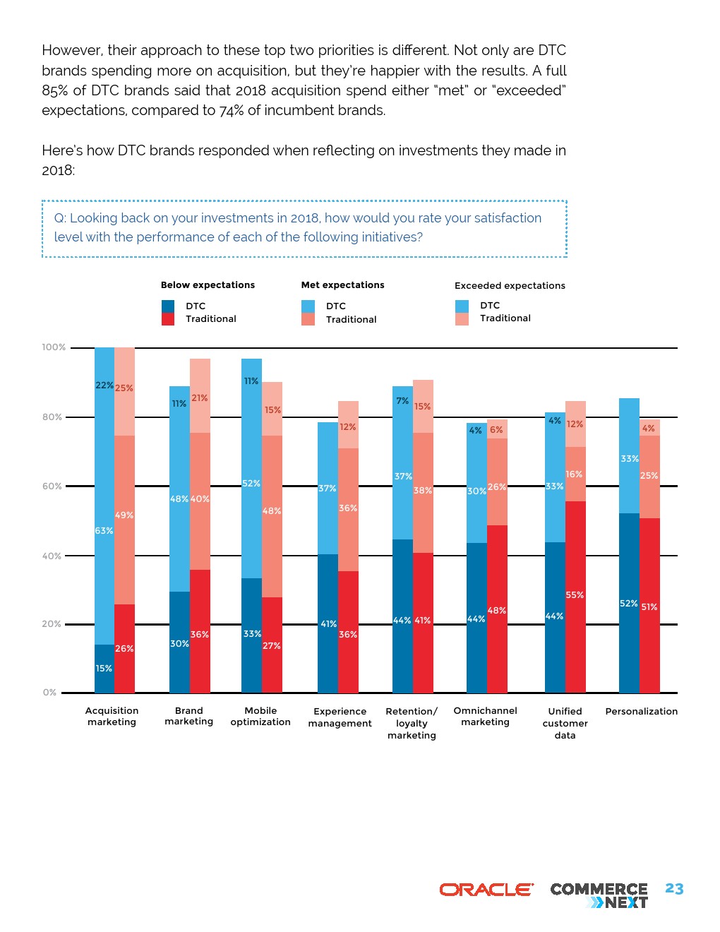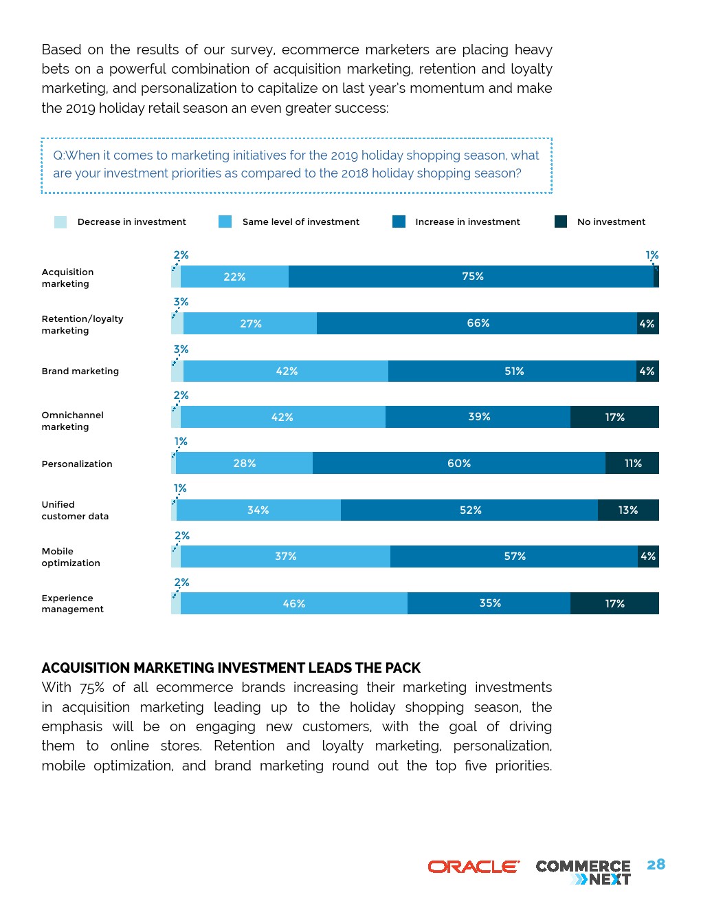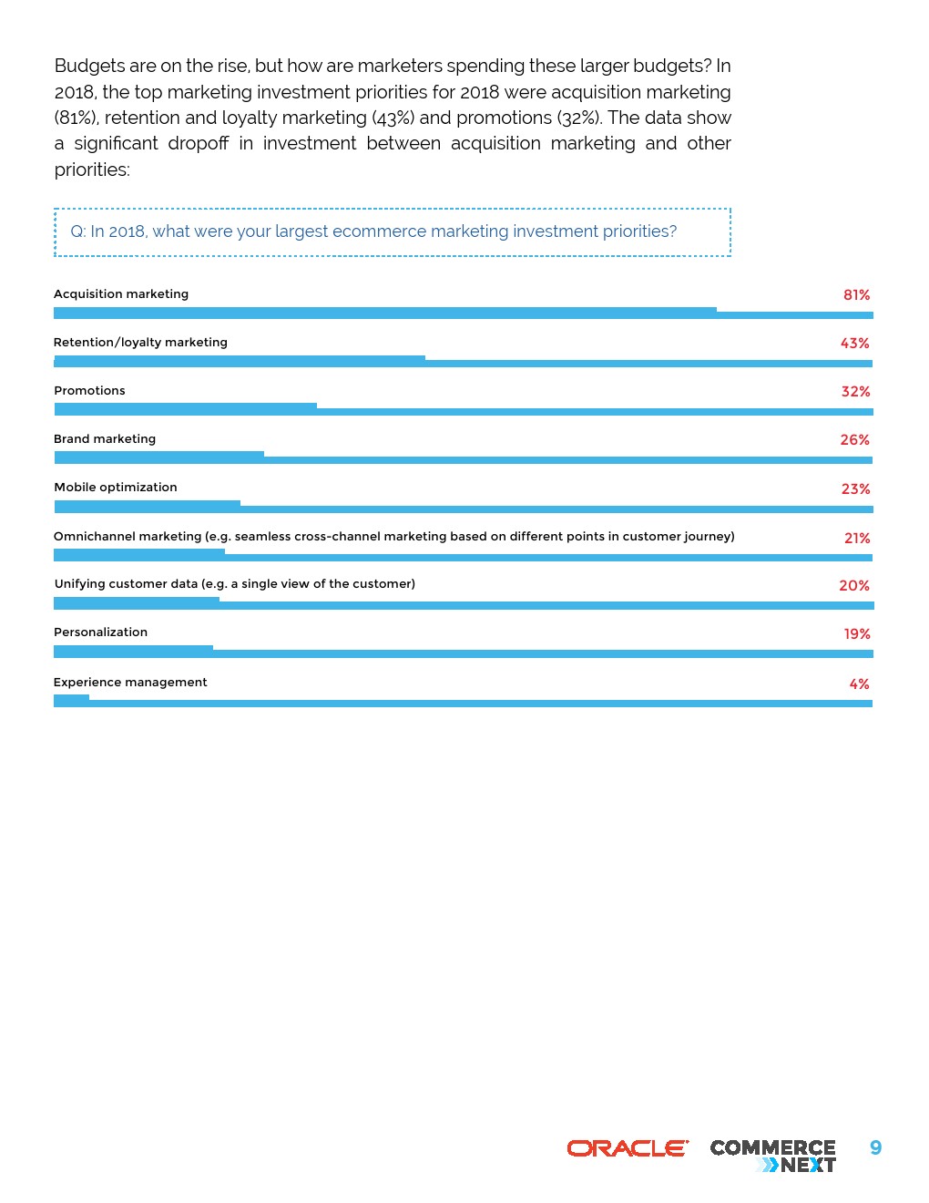 2018年,81%的电子商务营销人员将获得新客户作为他们的首要任务。市场营销人员对他们的投资结果感到满意,2019年在获得新消费者方面的支出甚至更多。