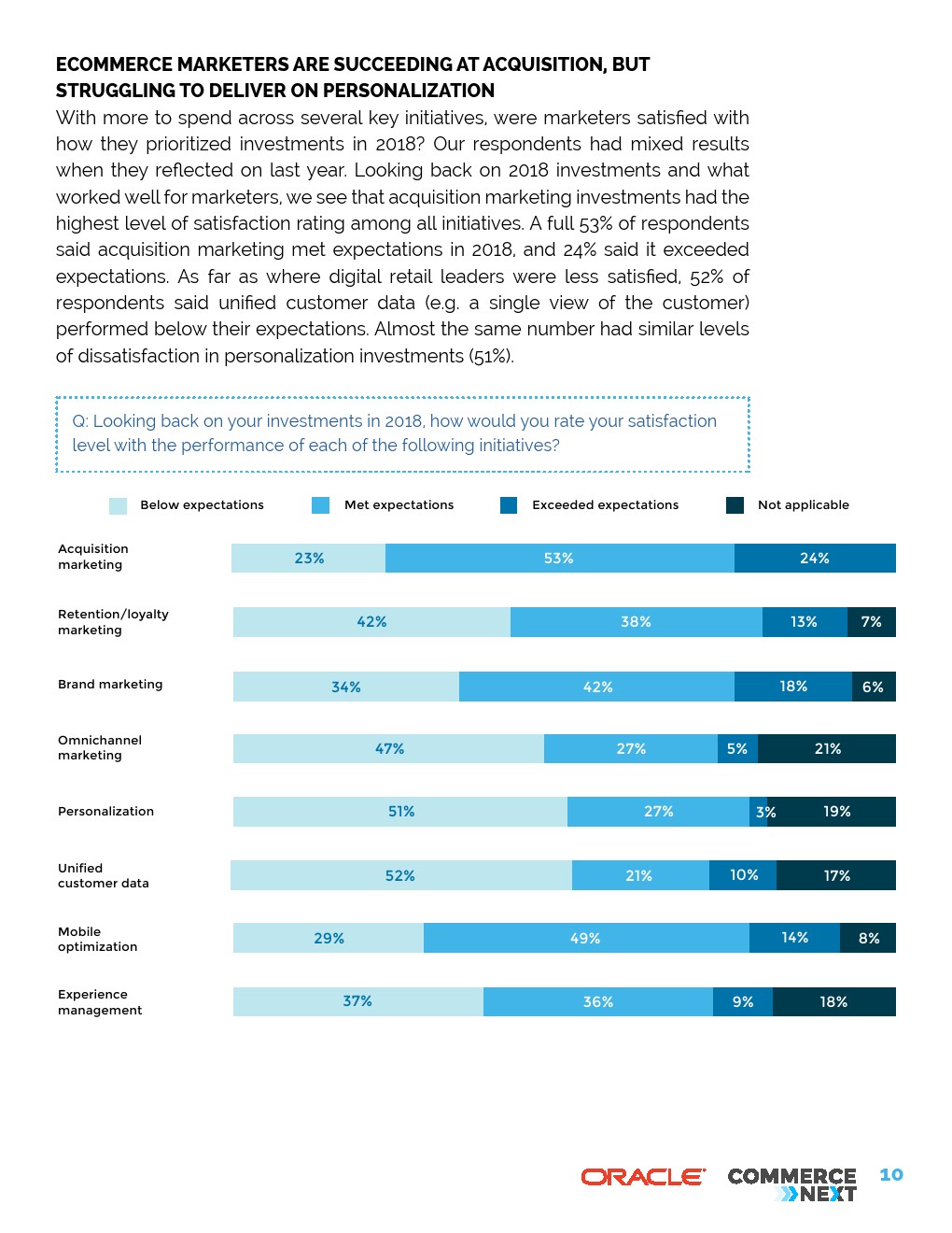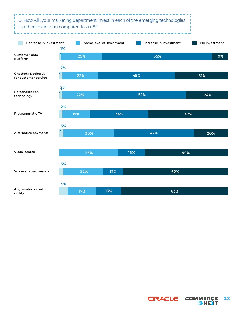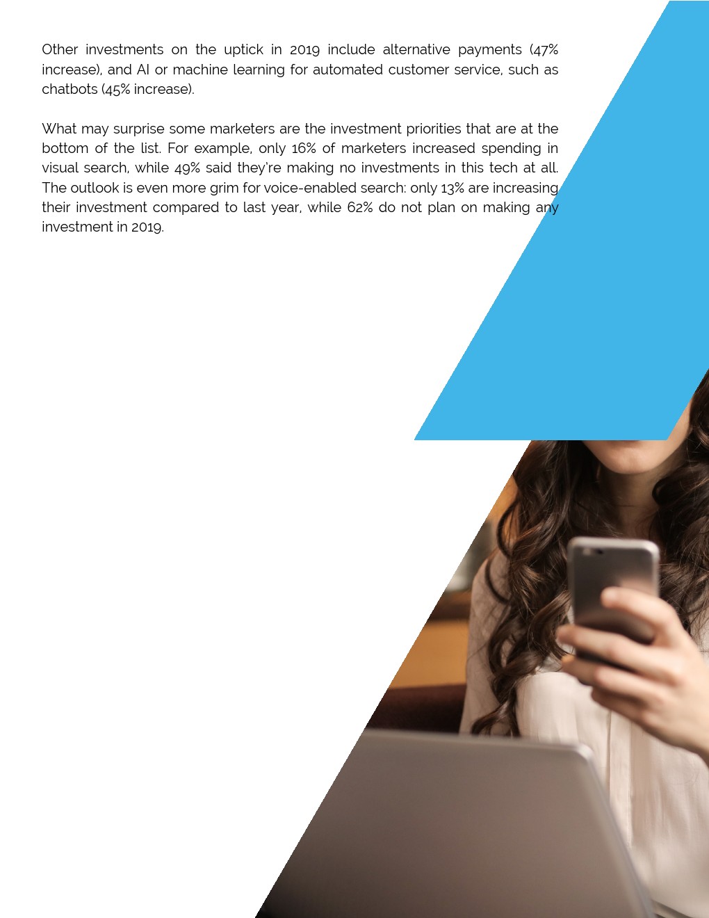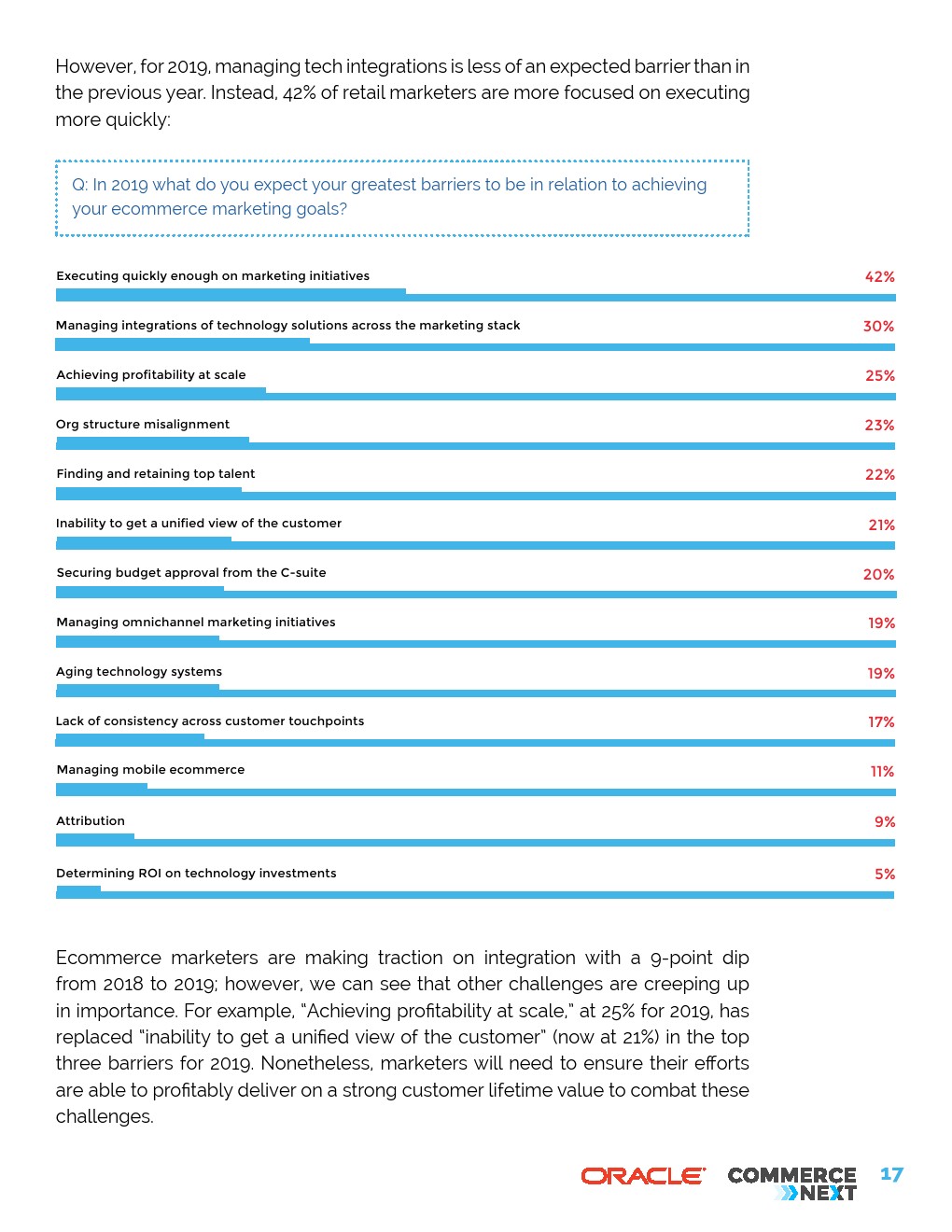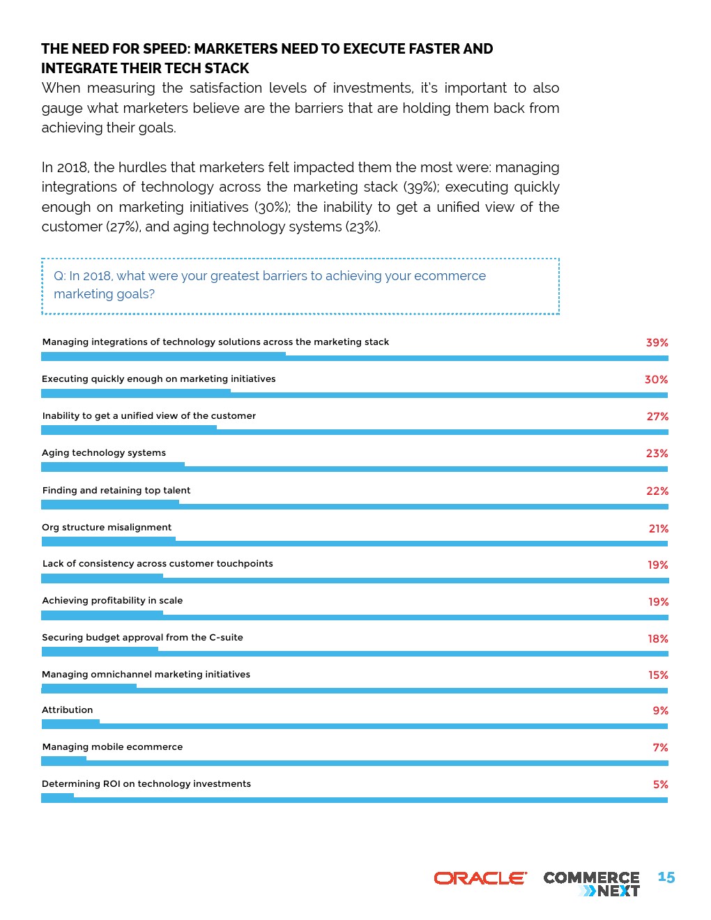 投资决策从来都不容易,营销人员正感受到前所未有的压力,要求他们做出正确的选择,迅速执行,并展示结果。事实上,30%的受访者承认,“足够快地执行营销计划”是他们在2018年实现电子商务营销目标的首要障碍,42%的受访者预计这仍然是2019年的障碍。